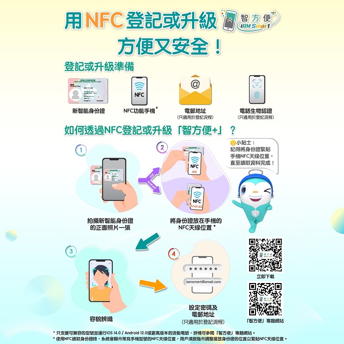 大公文匯全媒體報道,「智方便」流動應用程式至今已有超過270萬登記用戶,提供超過380項公私營機構的網上服務,每日平均有超過10萬人次登入使用「智方便」。資科辦今日(8日)公布,「智方便」流動應用程式將於本周四(11日)推出新版本(3.5.0)。新版本支持透過手機NFC(支援近場通訊)功能讀取新一代身份證,方便市民輕鬆登記或升級為具備數碼簽署功能的「智方便+」,毋須親身到自助登記站或服務櫃位登記。至於未有登記「智方便」的市民,下載新版本「智方便」即可直接登記為「智方便+」用戶。