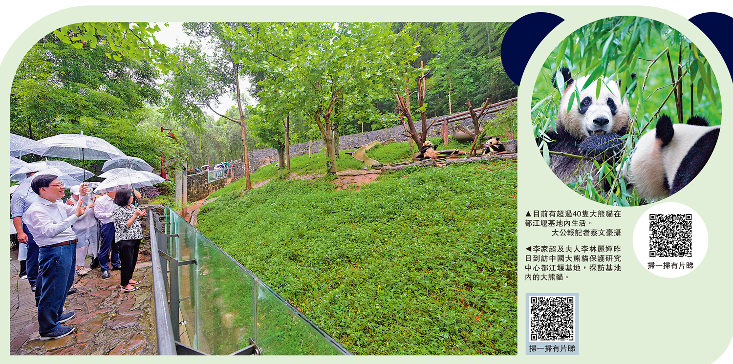 (大公報記者 湯嘉平、蔡文豪)行政長官李家超攜夫人林麗嬋,昨日到訪中國大熊貓保護研究中心都江堰基地(即「熊貓谷」),與國家林草局副局長、黨組成員李雲卿先生及熊貓中心黨委書記、副主任路永斌先生會面,了解關於大熊貓保育和討論四川與香港在這方面的進一步合作。