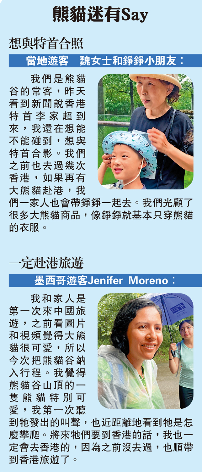 熊貓谷保安張先生向大公報記者表示,自己在園區守候大熊貓多年,得知要有國寶赴港,他雖有不捨,但更多的是開心,「香港是中國的特別行政區,我們送大熊貓去交流是件好事。」他指出,這能讓更多香港市民近距離接觸大熊貓,了解大熊貓和祖國的文化。