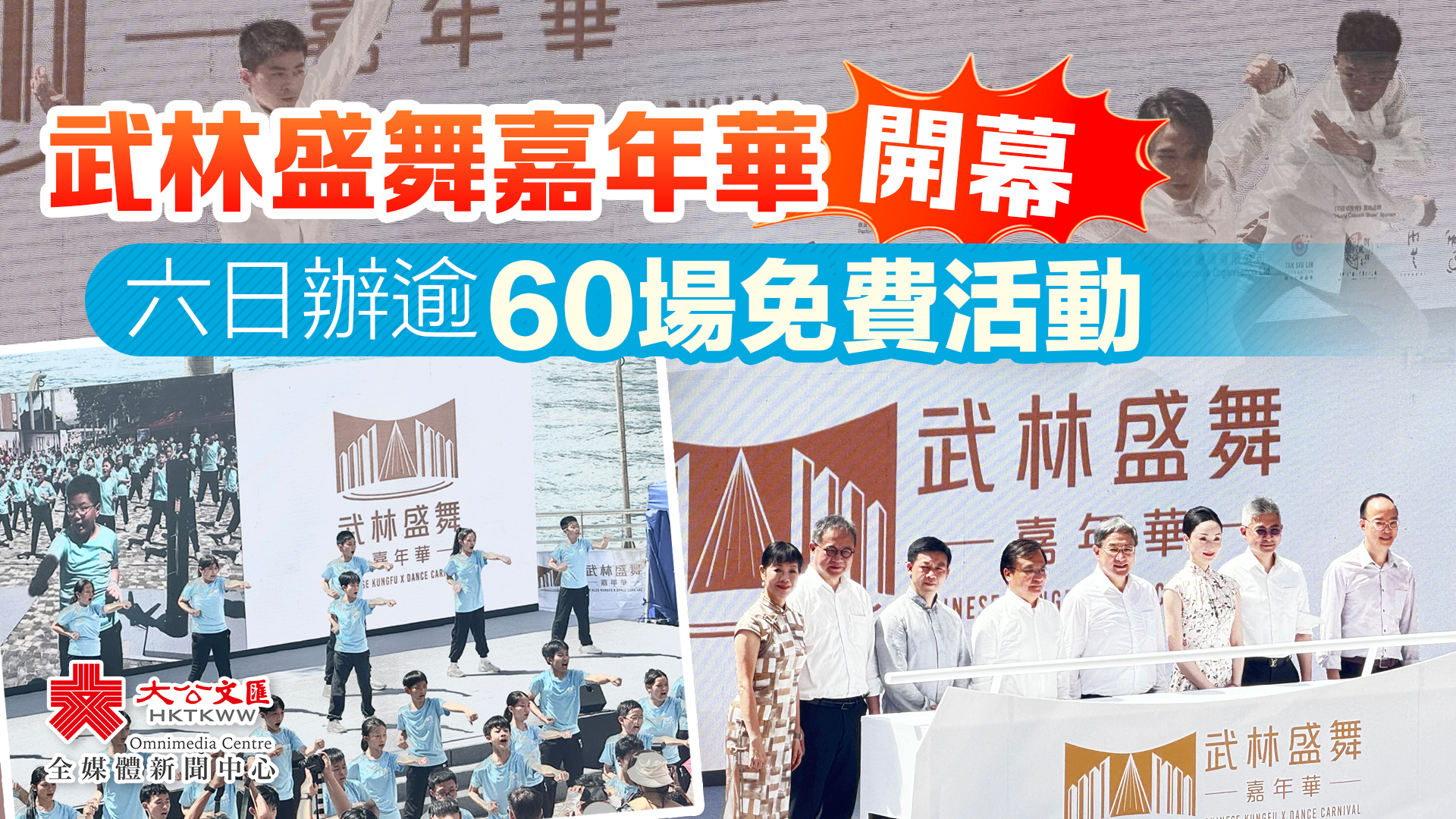 從今日起到7月14日期間,嘉年華將呈現超過60場活動,供市民免費參與,包括連續三天舉行的開幕節目、千人武術操、香港有一條功夫街、武術專場、唐詩樂舞、粵港澳大灣區舞蹈精品表演、功夫電影播放等活動。