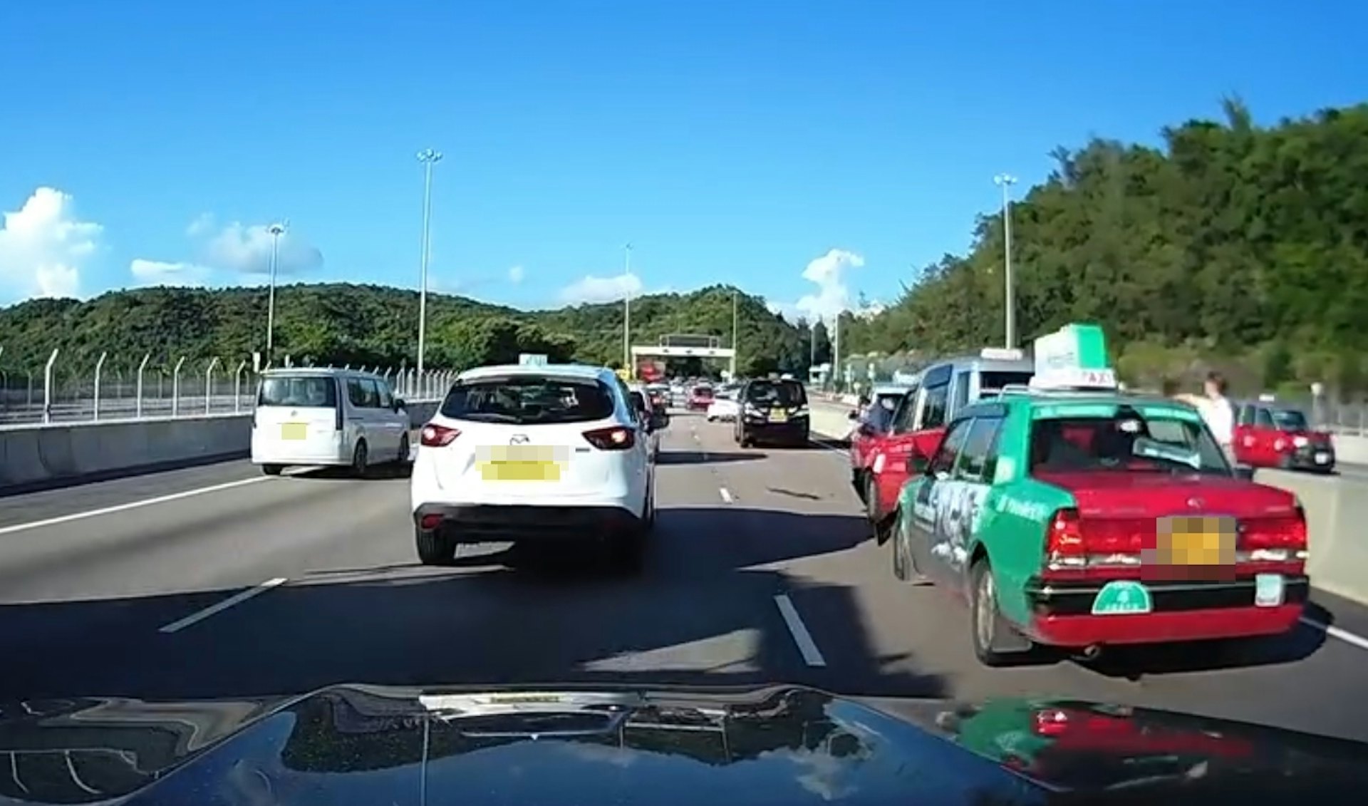 網上影片可見,車上司機及乘客下車後在路肩等候警方到場,有人下車檢查車輛的損毀情況。事故中,一名的士司機稱胸口疼痛。