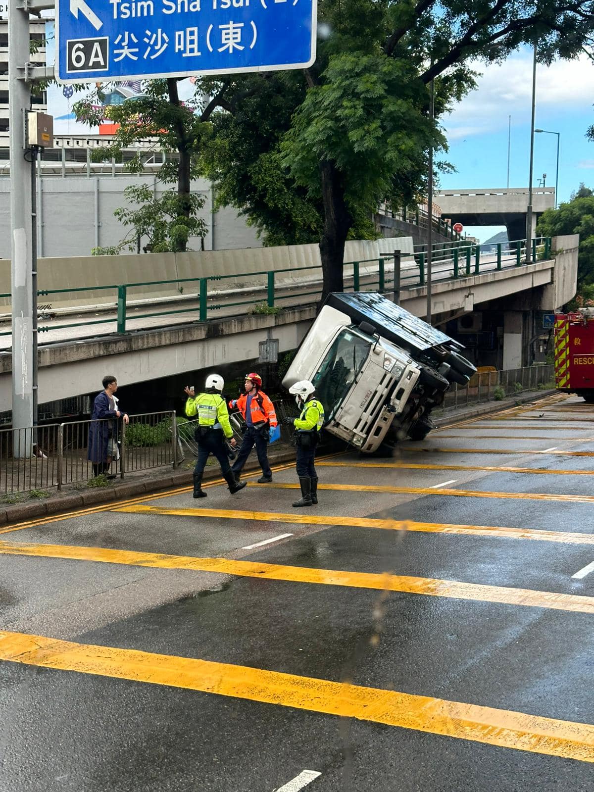 大公文匯全媒體報道,今日(10日)早上7時14分,一輛密鬥貨車沿紅磡康莊道往海底隧道過港島,駛至距離收費亭外約100米、近理工大學對開時,疑天雨路滑失控打轉,車頭逆轉壓落路邊欄桿。