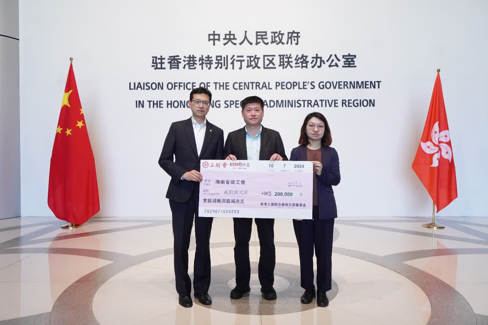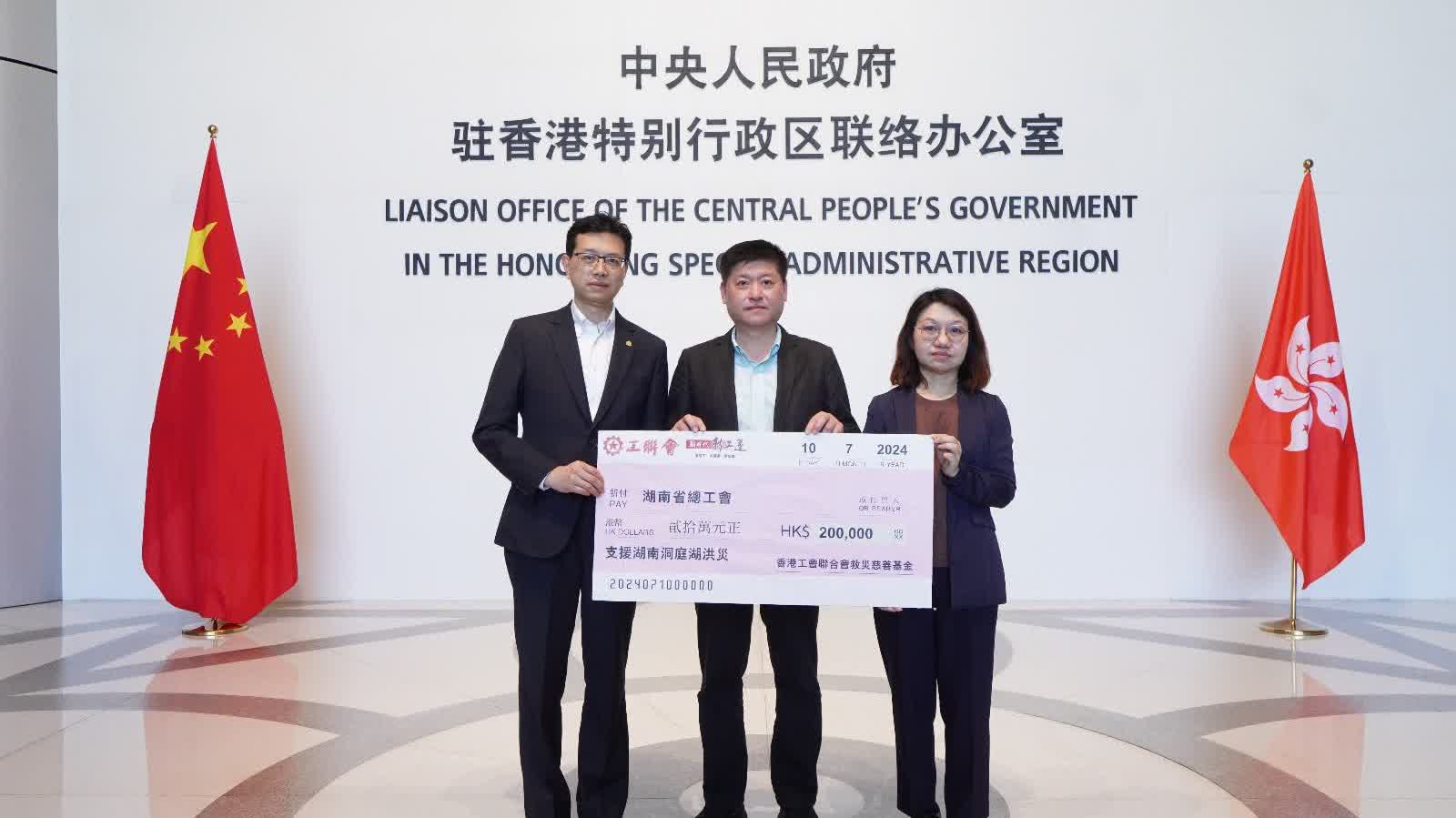 工聯會會長吳秋北,副會長曾志文今日(10日)將20萬元善款支票遞交給中央政府駐港聯絡辦,希望轉交給湖南省總工會作為賑災之用,由中央政府駐港聯絡辦社工部副部長周蔚代表接收。