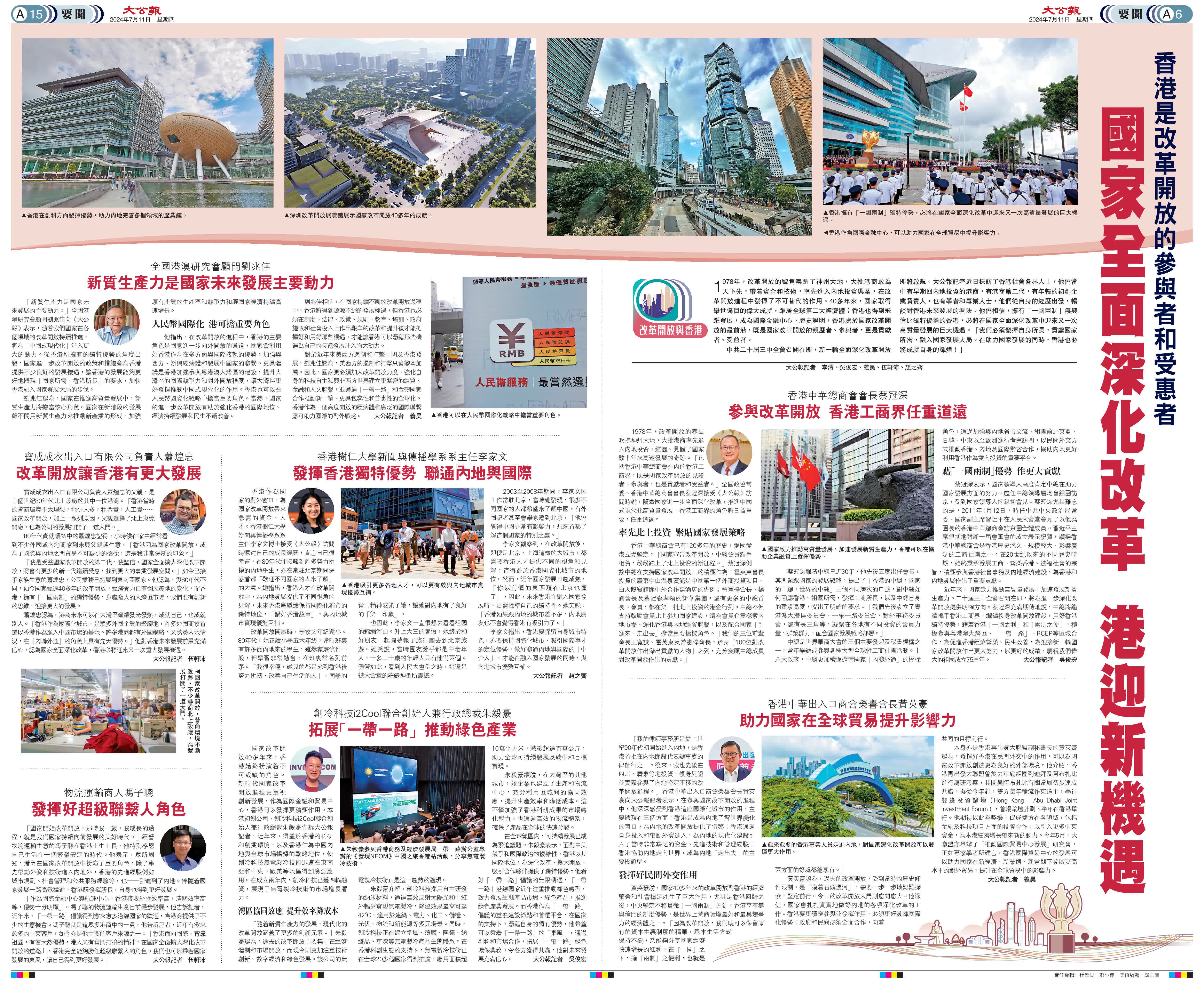 中共二十屆三中全會召開在即,新一輪全面深化改革開放即將啟航。大公報記者近日採訪了香港社會各界人士,他們當中有早期回內地投資的港商,有港商第二代,有年輕的初創企業負責人,也有學者和專業人士,他們從自身的經歷出發,暢談對香港未來發展的看法。他們相信,擁有「一國兩制」無與倫比獨特優勢的香港,必將在國家全面深化改革中迎來又一次高質量發展的巨大機遇。「我們必須發揮自身所長,貢獻國家所需,融入國家發展大局。在助力國家發展的同時,香港也必將成就自身的輝煌!」