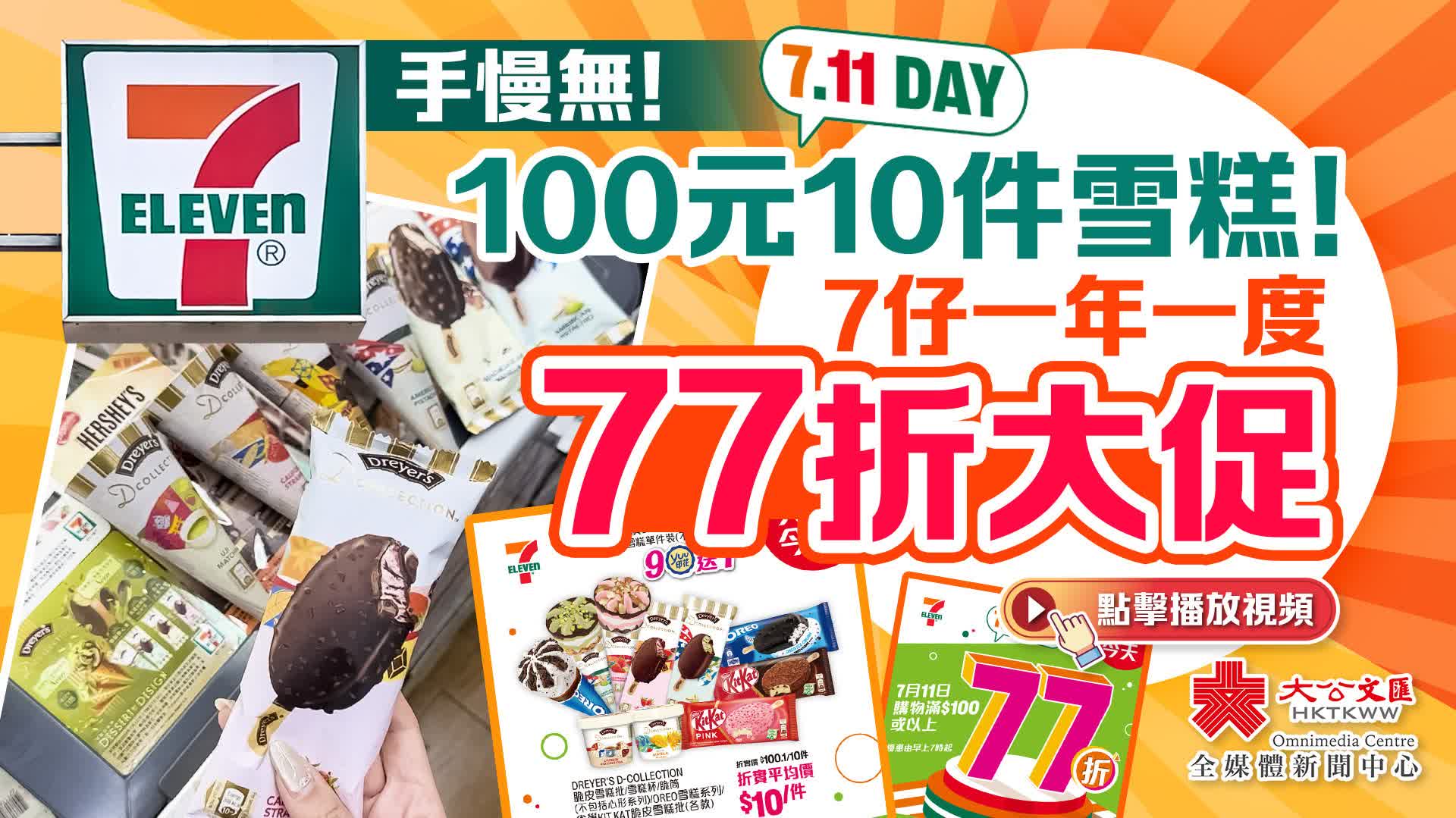 大公文匯全媒體報道,便利店7-Eleven一年一度的「7·11大折日」又來了!7-Eleven今日(11日)推出一日限定的超值優惠,早上7時至晚上11時59分之間,凡購物滿100元或以上,即可享受全場77折優惠。