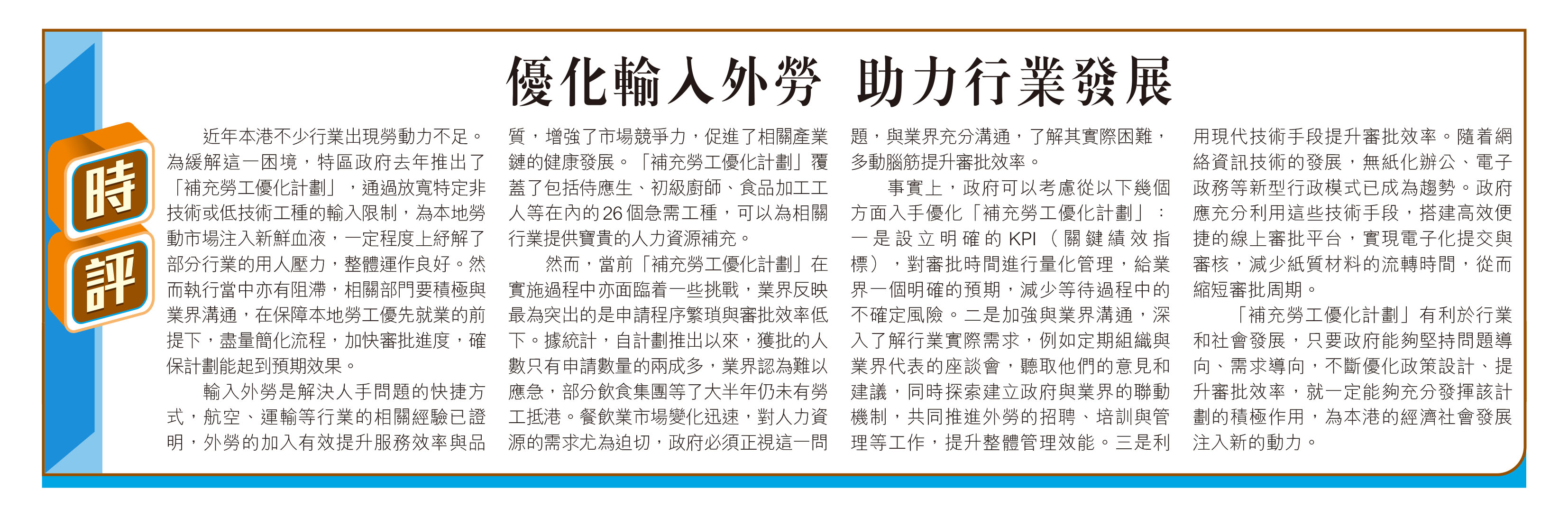 「補充勞工優化計劃」有利於行業和社會發展,只要政府能夠堅持問題導向、需求導向,不斷優化政策設計、提升審批效率,就一定能夠充分發揮該計劃的積極作用,為本港的經濟社會發展注入新的動力。
