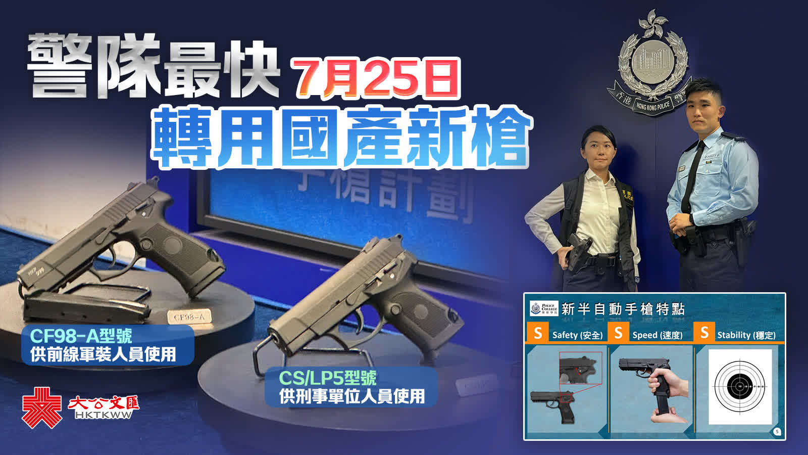(香港文匯報記者 李芷珊)香港警隊為配合長遠行動需要,昨日正式公布更換手槍計劃,表示已經採購兩款國產9毫米口徑半自動手槍,型號分別為CF98-A和CS/LP5,將逐步取代現時軍裝警員使用的「史密夫威信(Smith & Wesson)軍警十型」左輪手槍,以及刑偵人員使用的「適格紹爾」(SIG Sauer)P250半自動手槍。新的國產半自動手槍具有安全性高、操作速度快和穩定性高三大優點。首批完成新槍訓練的警務人員,包括衝鋒隊、機動部隊等將於7月25日獲配發新半自動手槍執勤,未受新槍訓練人員則繼續使用現有手槍。