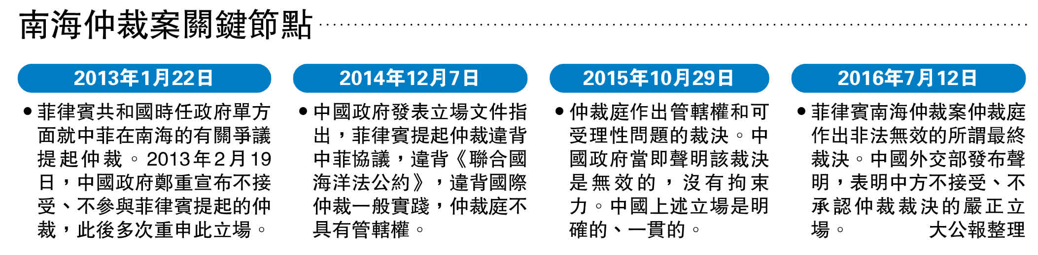 據新華社此前報道,2016年7月12日,由菲律賓單方面請求建立的菲律賓南海仲裁案仲裁庭作出非法無效的所謂最終裁決,企圖損害中國在南海的領土主權和海洋權益。其時,中國外交部發布聲明,表明中方不接受、不承認仲裁裁決的嚴正立場,並發布《中華人民共和國政府關於在南海的領土主權和海洋權益的聲明》,闡述中國在南海享有的領土主權和海洋權益。