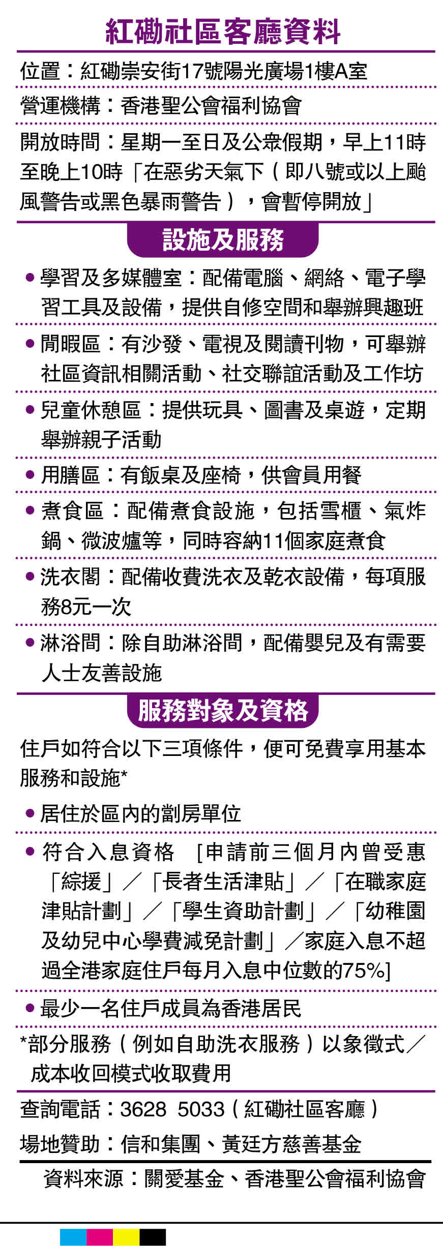 紅磡社區客廳設於崇安街的商場一樓,實用面積約3200平方呎,由香港聖公會福利協會營運,信和集團及黃廷方慈善基金提供場地,關愛基金提供項目資助。記者昨日現場直擊,內裏設有學習及多媒體室、用餐區、煮食區、洗衣乾衣區以及淋浴間等。而現場設有屏幕,供合資格人士申請成為會員,並可供預訂設施。社區客廳另有提供暫託和義工等服務予合資格的劏房戶。