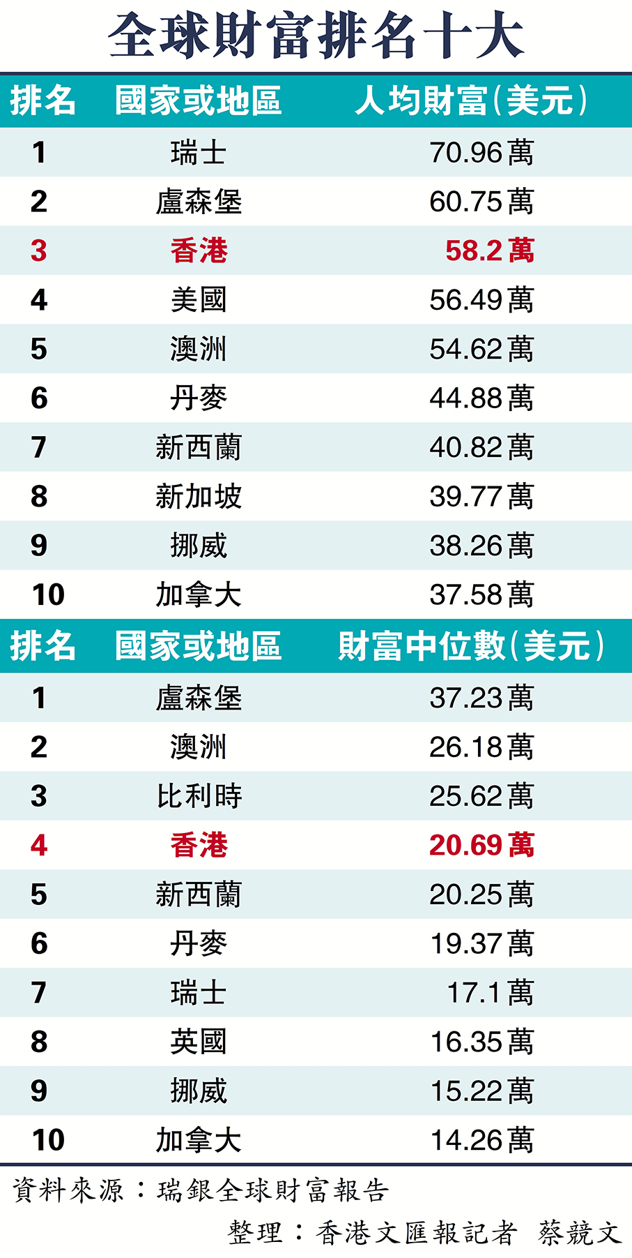 瑞銀報告顯示,香港成年人平均財富位居全球第三位,第一位為瑞士,人均70.96萬美元;第二位的盧森堡人均60.75萬美元;被視為香港主要競爭對手的新加坡人均39.77萬美元,排名全球第八。報告亦顯示,香港百萬美元富翁比率約為10%。