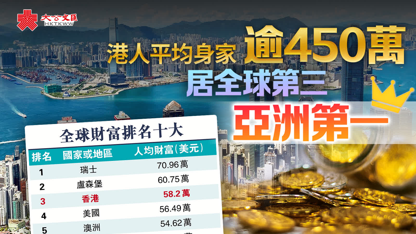 (香港文匯報 記者 蔡競文)瑞銀發表的2024全球財富報告數據顯示,去年香港人均財富約58.2萬美元(約454萬港元),較2022年高出5.5%,全球排名第3位,僅次於瑞士及盧森堡,在亞洲排首位。另外,以財富中位數來看,港人財富中位數為20.69萬美元,相當於約161萬港元,位列全球第四。