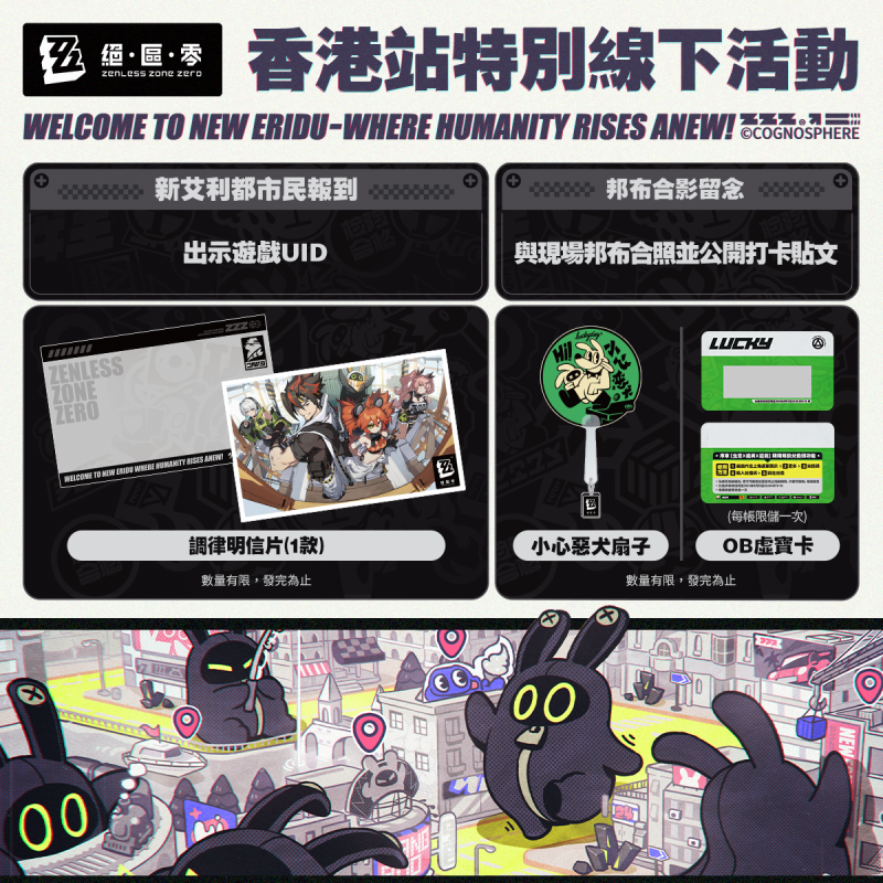 Step1.玩家到現場和邦布拍照打卡上傳,並加上限定Hashtag,即可兌換「《絕區零》1.0版本虛寶卡乙張」和「小心惡犬扇子乙把」。