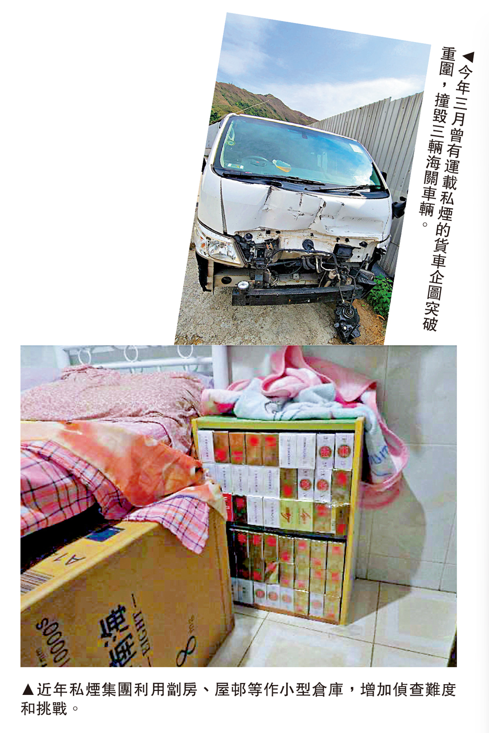 私煙利潤高,私煙集團組織嚴密,護航車隊龐大,會阻撓海關車輛的追截,甚至遇過載有私煙的貨車,司機為逃走驅車企圖突破重圍,撞毀三輛海關車輛,險象環生。事件發生於今年3月,海關於凌晨在新界偏遠位置發現一部可疑貨車,當人員上前截查時,司機企圖逃走,多次駕車試圖撞走多輛海關車輛。人員經口頭警告不果後,遂打破貨車車窗將司機制服。該案件揭發有人利用多部貨車作儲存及分銷私煙,行動中共檢獲五部貨車及1部私家車,並檢獲約410萬支私煙。