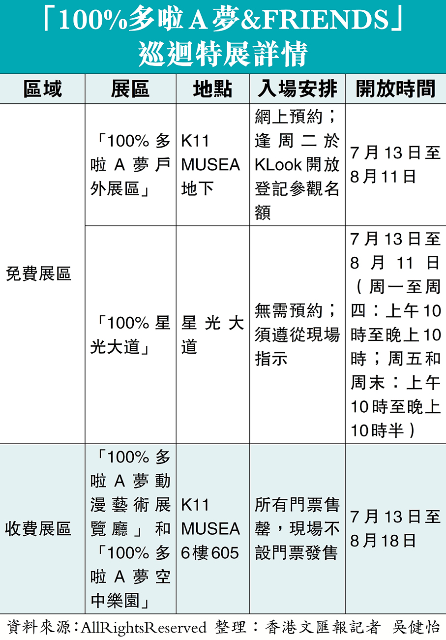 大公文匯全媒體報道,「人人期望可達到,我的快樂比天高!」多啦A夢是不少港人的童年回憶,作為香港盛事活動之一的「100%多啦A夢&FRIENDS」巡迴特展首站今日(13日)起正式登陸香港,將繼續掀起一股多啦A夢熱潮。展覽分收費和免費展區,位於K11 MUSEA 6樓的收費展區開放至下月18日,門票已全部售罄。設於星光大道暨海濱的免費展區則開放至下月11日,但其中的「100%多啦A夢戶外展區」將不設現場輪候入場,市民需預先於網上登記。