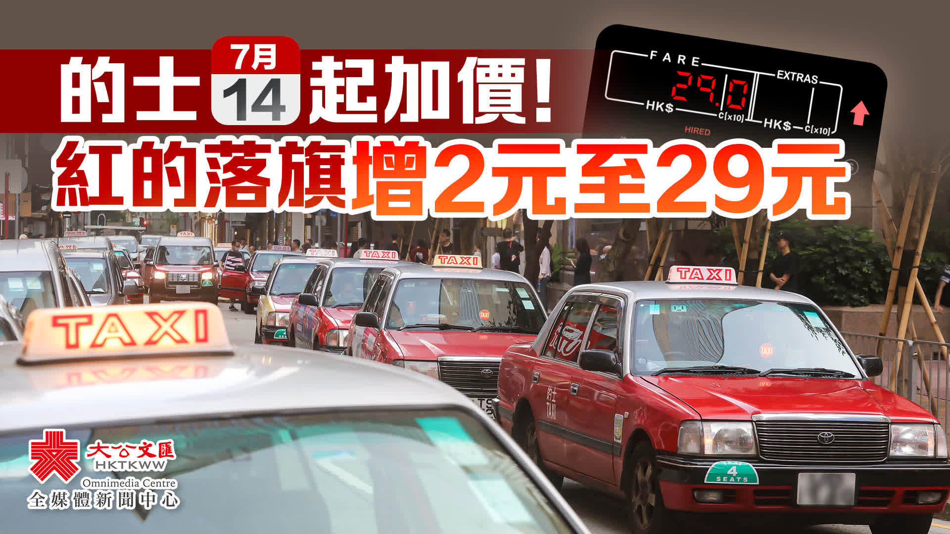 大公文匯全媒體報道,運輸署今日(13日)宣布,巿區、新界及大嶼山的士新收費將由明日(14日)起生效,落旗收費較前增加2元,落旗後首段跳錶收費每跳增加2毫,後段跳錶收費則每跳增加1毫。