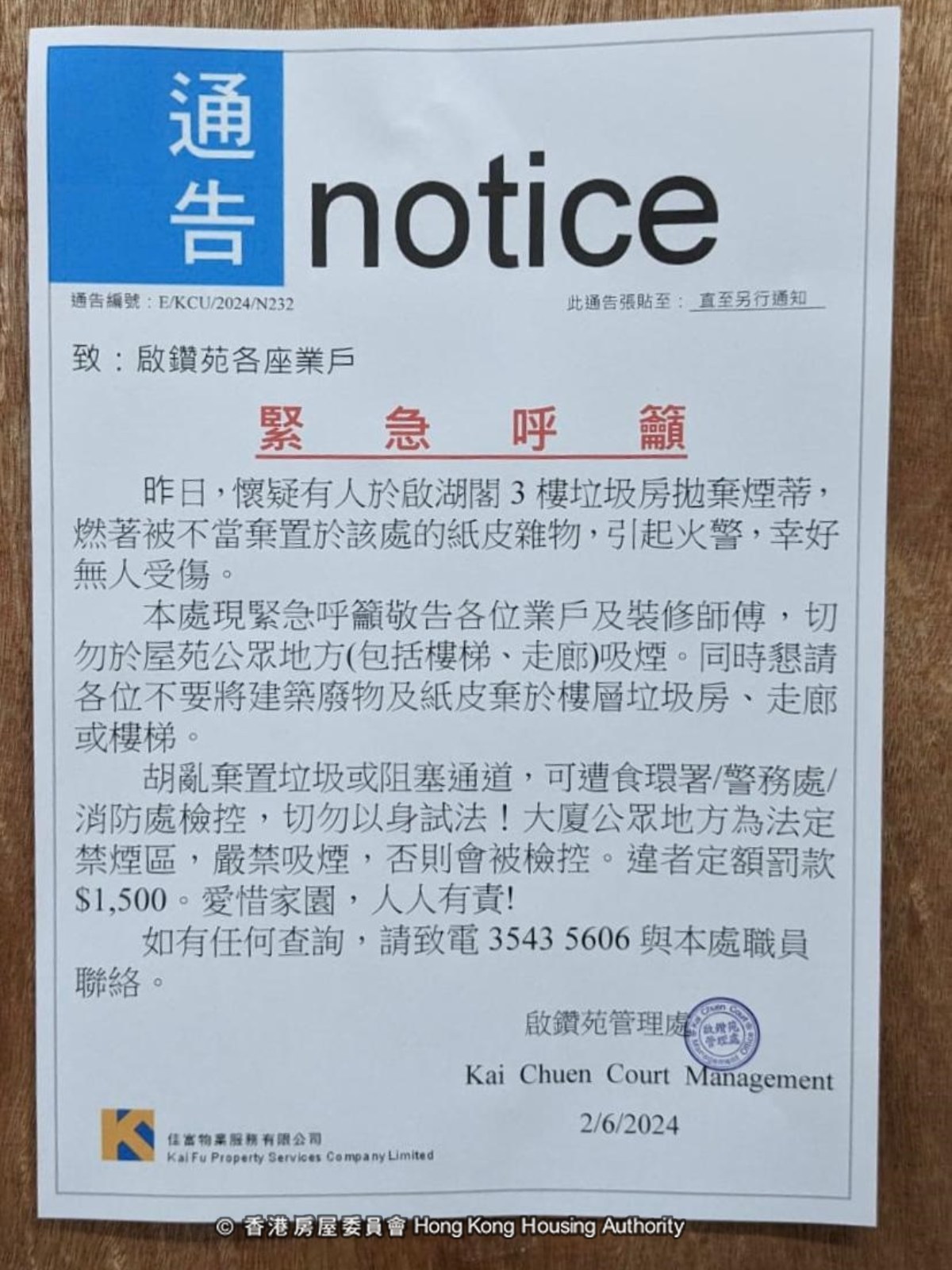 相關報道引起房屋局重視並積極調查。房委會今日(13日)在社交平台回應澄清,指啟鑽苑第二期自2024年2月入伙以來曾發生3次火警,一次在裝修中的單位內發生,兩次在垃圾房。其他的都是警鐘誤鳴個案,原因包括有人食煙或工人觸發煙霧頭、意外碰撞到火警鐘手掣等。