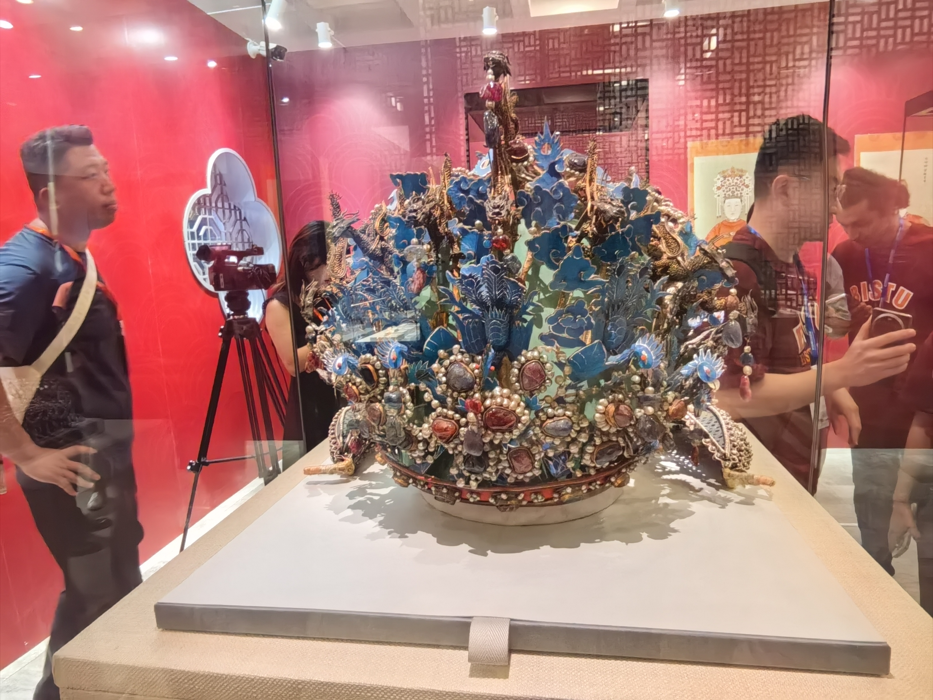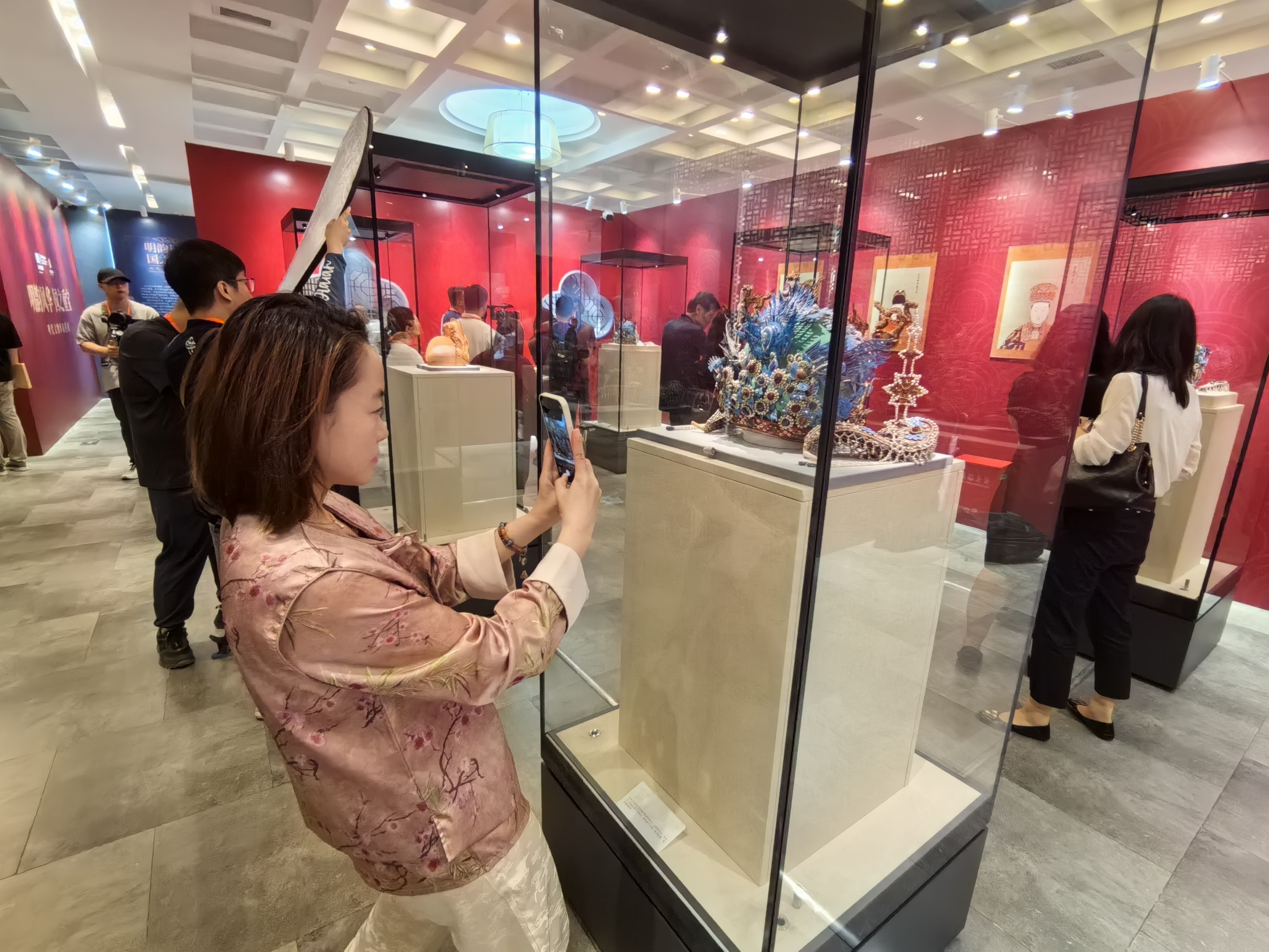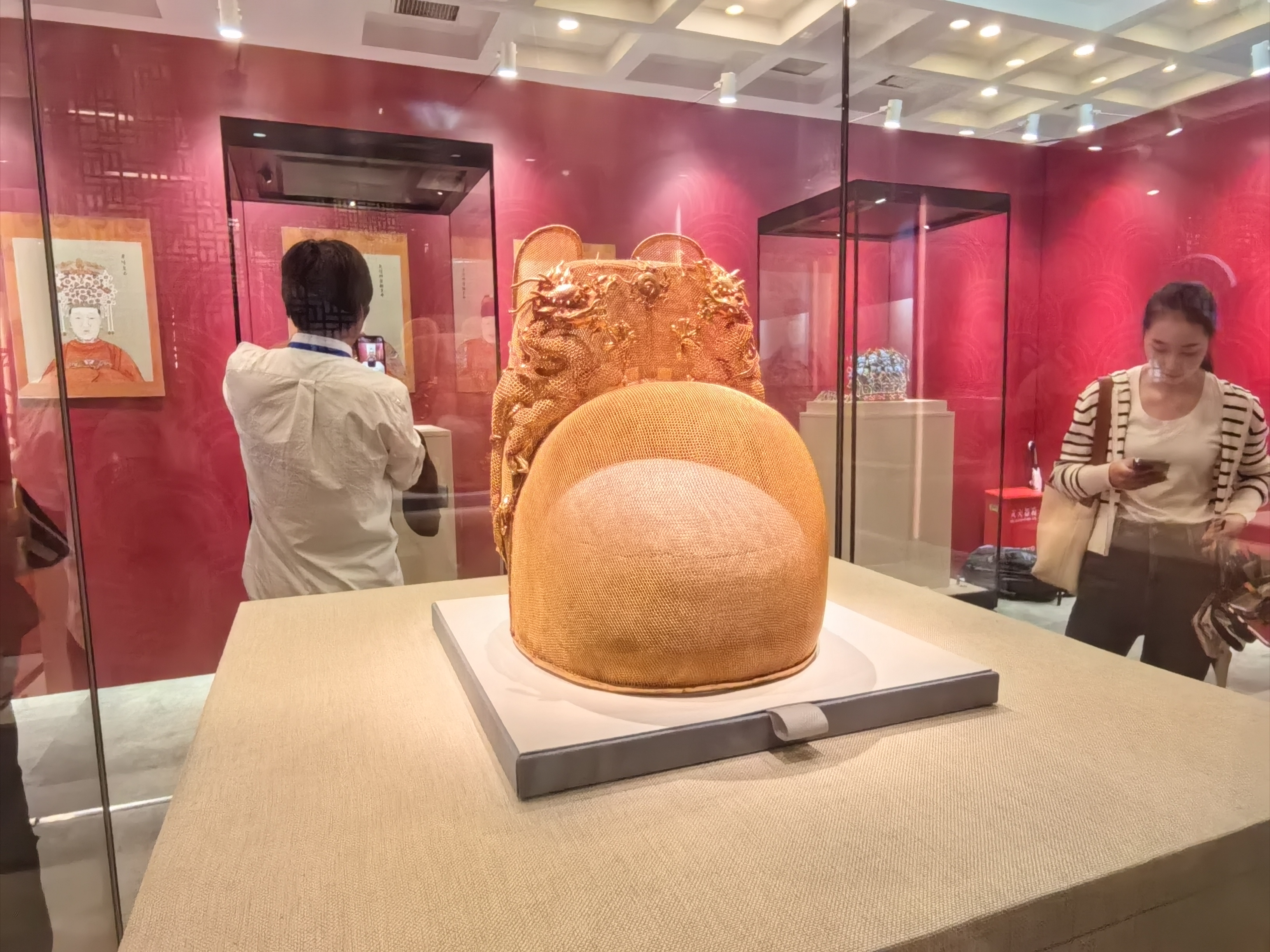 作為2024明文化論壇五大展覽之一的「明韻風華 國之重寶——明代文物珍品特展」,在開幕當天同步開展,特展為期兩天,國內10餘家文博機構共100餘件精品文物參展,以皇廷重器為主,包括金絲翼善冠和皇后鳳冠,董其昌書法真跡、皇史宬金匱、《永樂大典》嘉靖副本等。展廳中,黃緙絲十二章福壽如意袞服、玉雕萬壽海棠金托執壺、保明寺銅鐘等珍貴文物在展櫃中整齊擺放,不少觀眾駐足拍照。