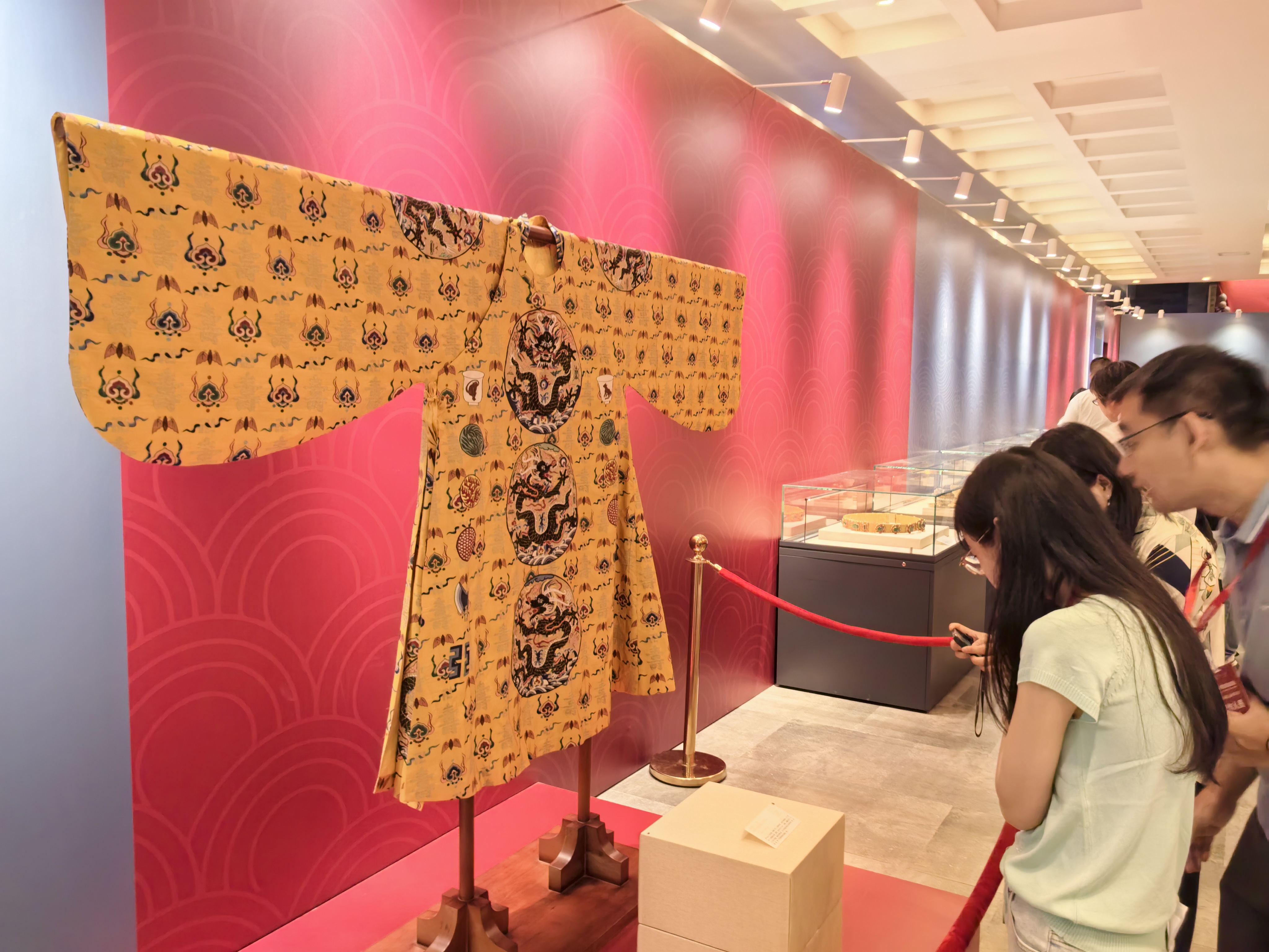 據介紹,本次特文物種類多樣,來自定陵博物館的黃緙絲十二章福壽如意袞服,通體由緙絲工藝純手工織造而成,一寸緙絲一寸金,貴比黃金的緙絲因其織造繁複,觀賞性和裝飾性極強;玉雕萬壽海棠金托執壺,倒龍首形細長流,壺身刻有「壽」與「卍」字,取意「萬壽無疆」;造於明隆慶六年的保明寺銅鐘,重量超400公斤,至今保存完好,為學者研究明朝各類官員、命婦的官階品級提供重要佐證。