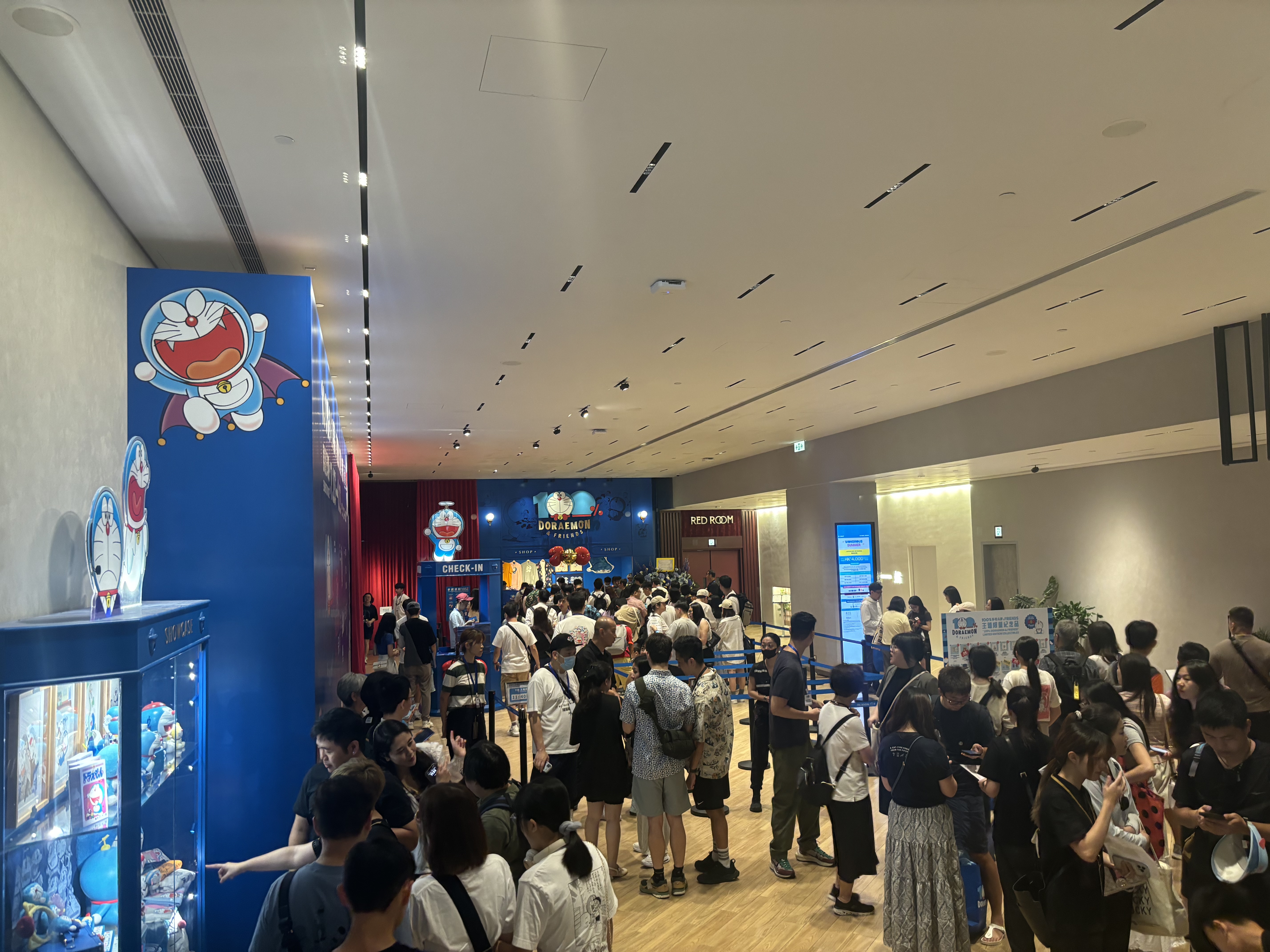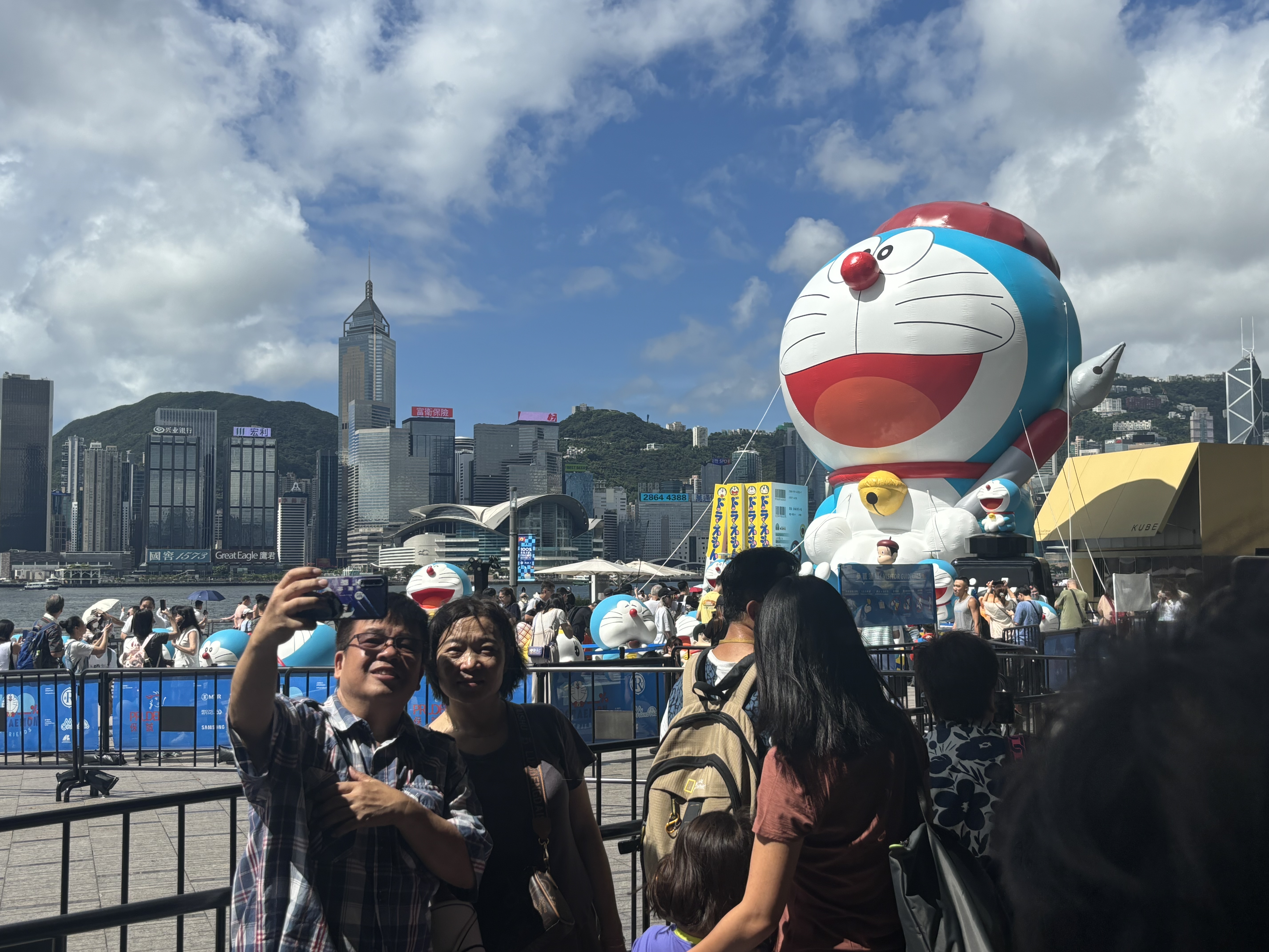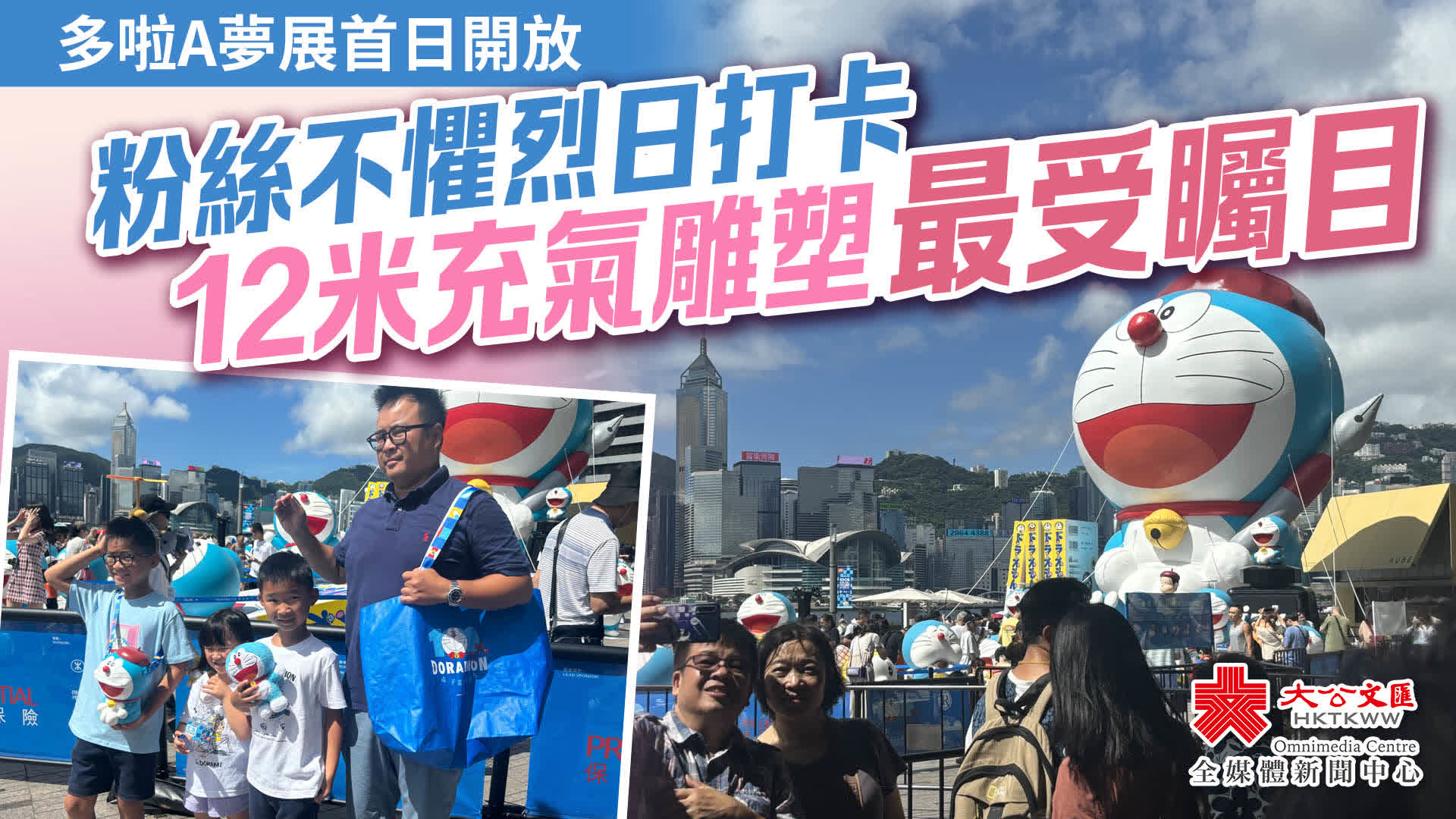 (大公文匯全媒體 記者 鄭洢林)全城期待的「100%多啦 A夢&FRIENDS」巡迴特展首站於今日(13日)正式登陸香港。雖然烈日當空,氣溫亦一度超過30度,但仍有不少粉絲身着多啦A夢元素的衣服或飾品前往打卡。記者於早上9點半抵達尖沙咀星光大道免費展區入口,發現已經有預約好第一批入場的市民在排隊。
