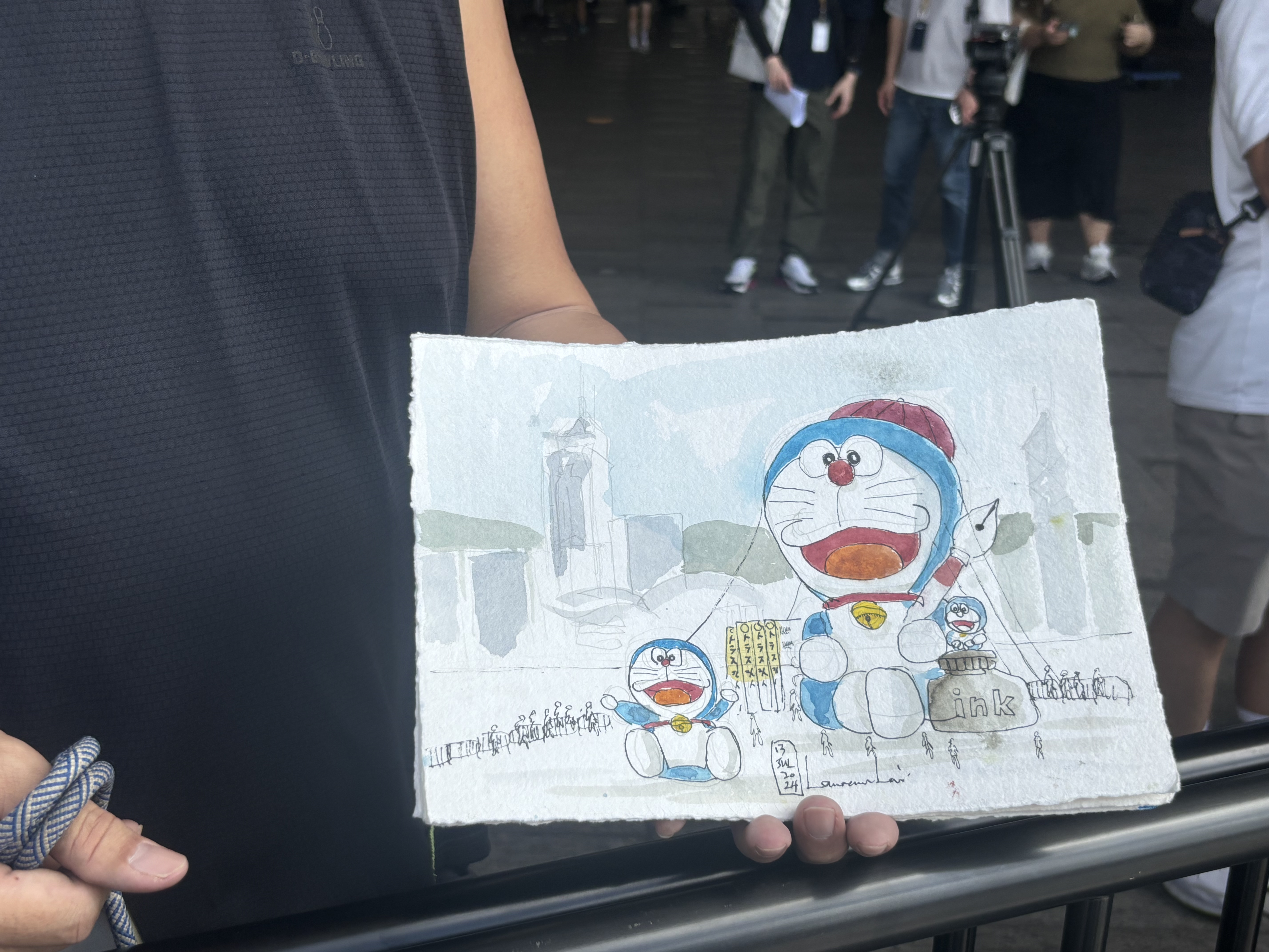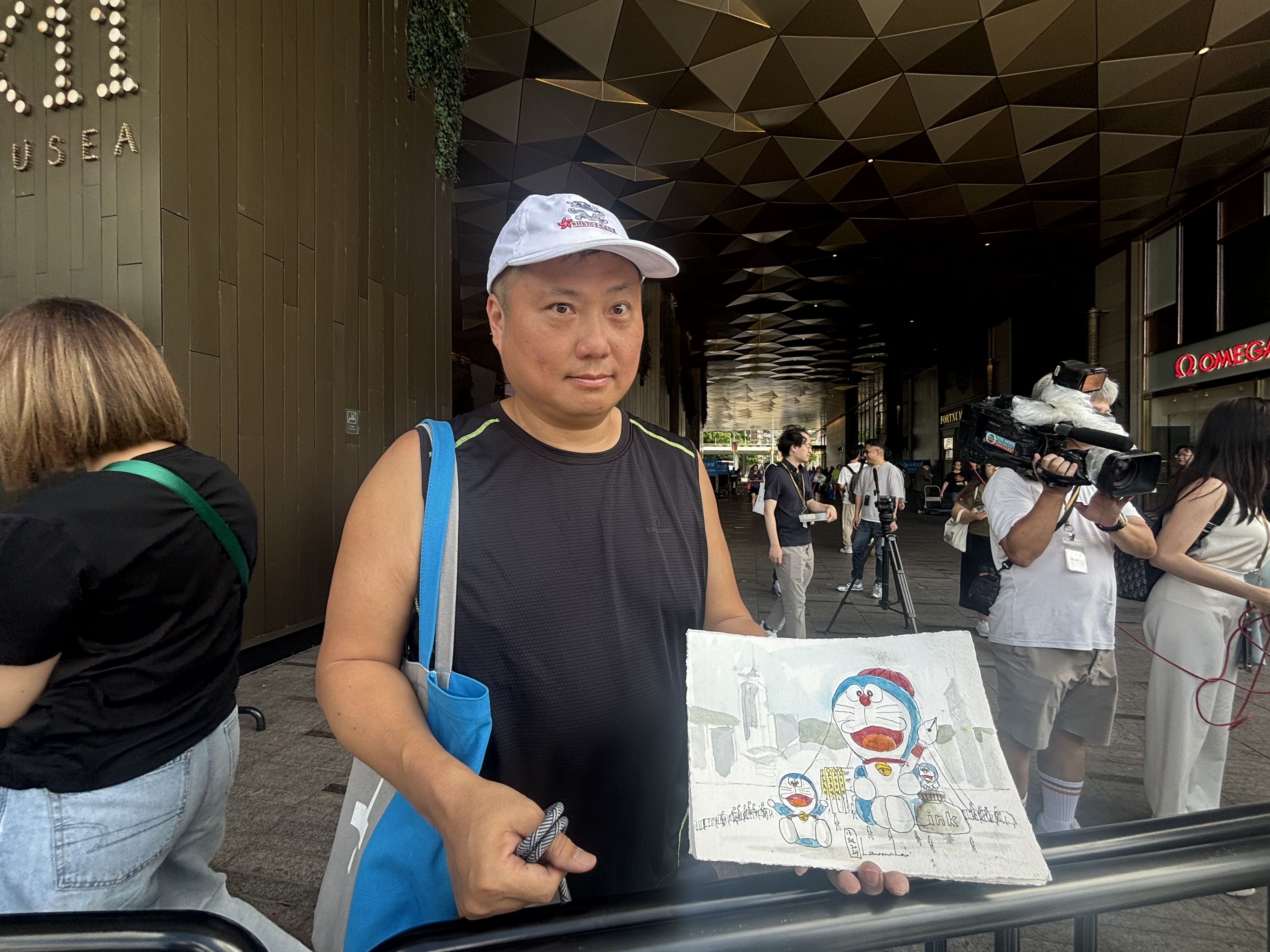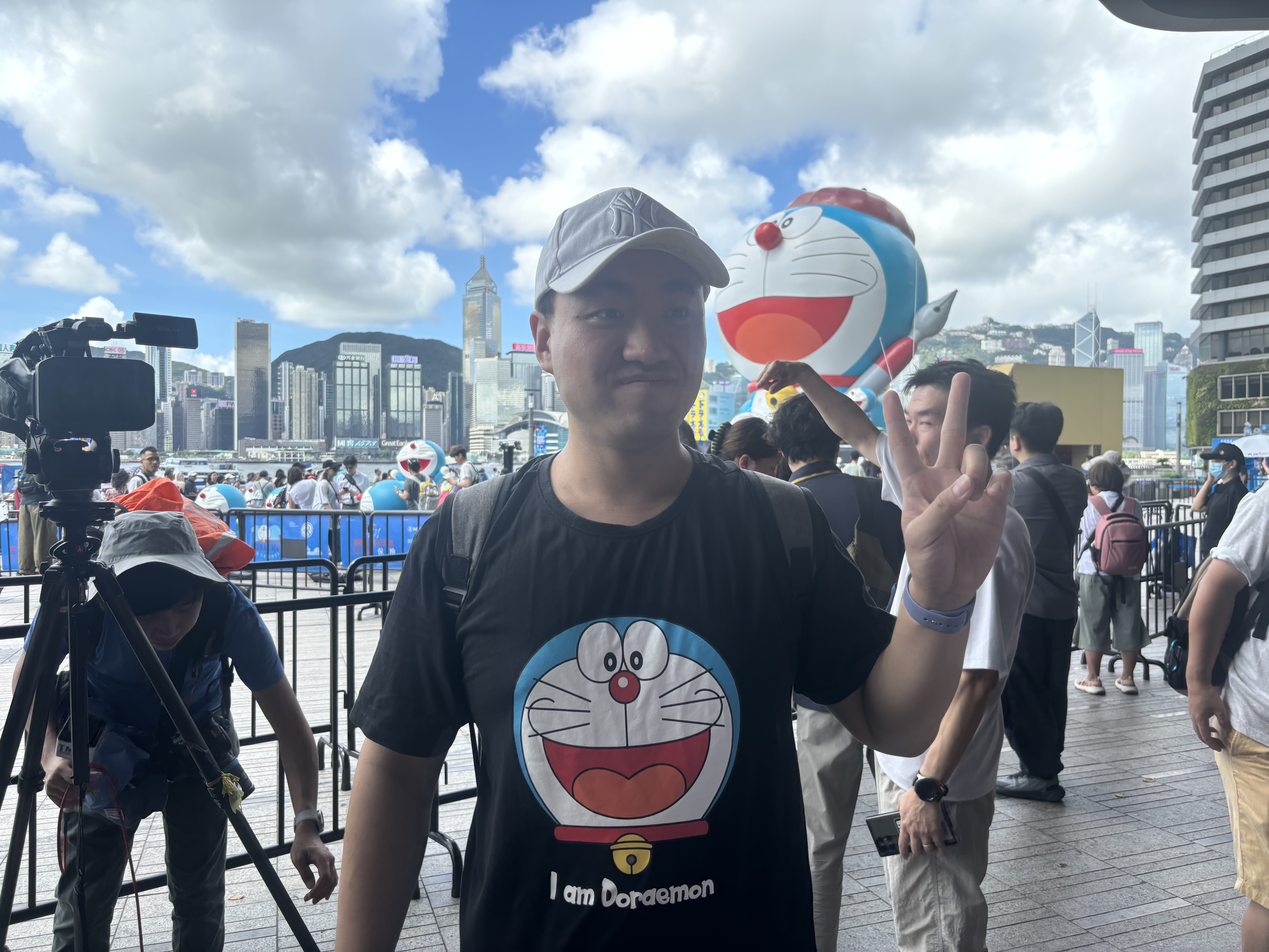 黎先生喜愛了多啦A夢40年,今早八點半就到場,並花了大概40分鐘親手畫出了維港邊多啦A夢展的景象,他向記者表示在場外也可以看到展,還有微微的海風,這個場地設置讓人很舒適。本身自己也很喜歡多啦A夢,小時候放學沒什麼娛樂,回到家就會打開電視看這部動漫,多啦A夢的百寶袋裏有很多法寶,滿足了當時的自己很多幻想,也與這部動漫建立深厚的感情。他感嘆,「這部動漫陪伴了幾代的人成長,所以今天專門過來用自己的方式紀念下這個展覽」。