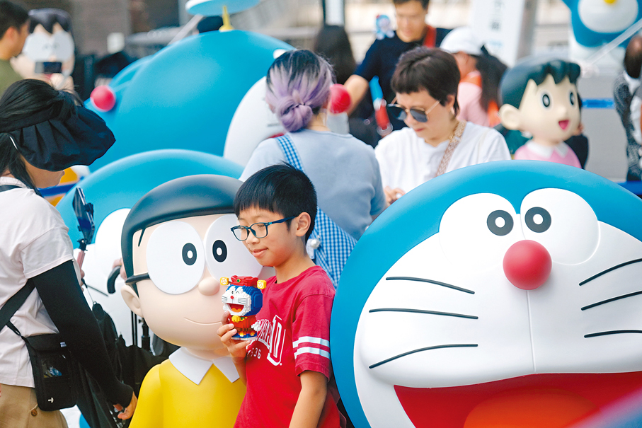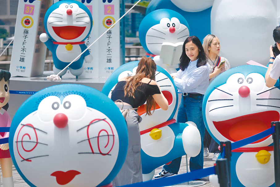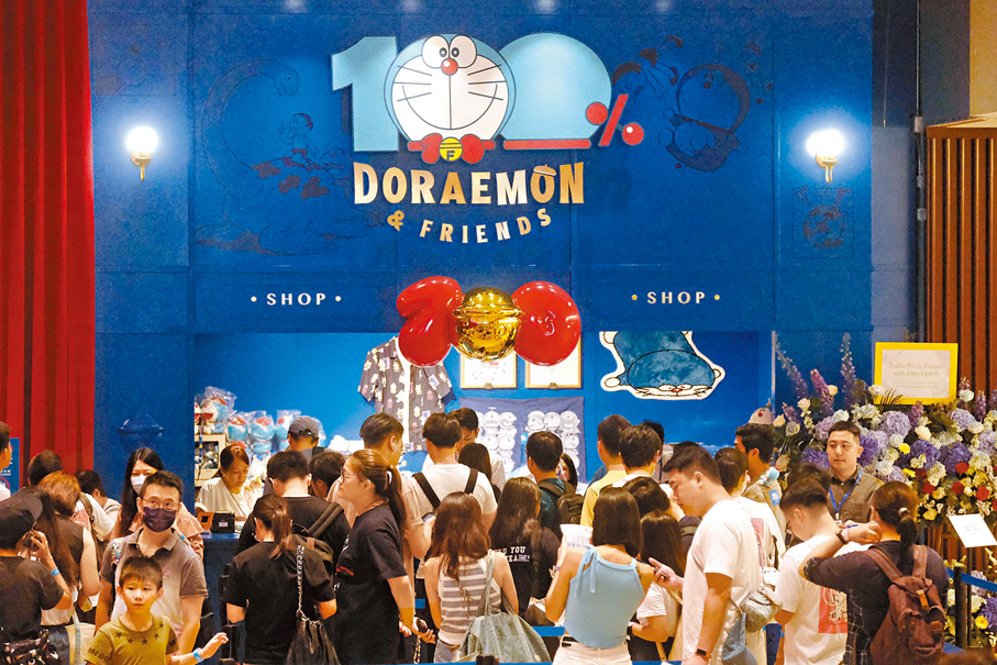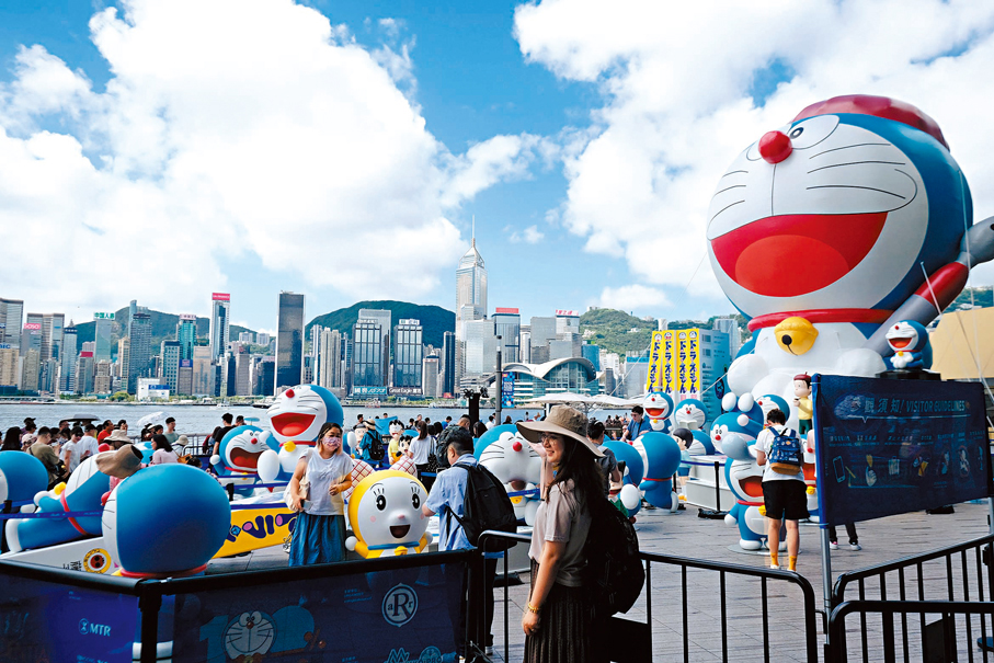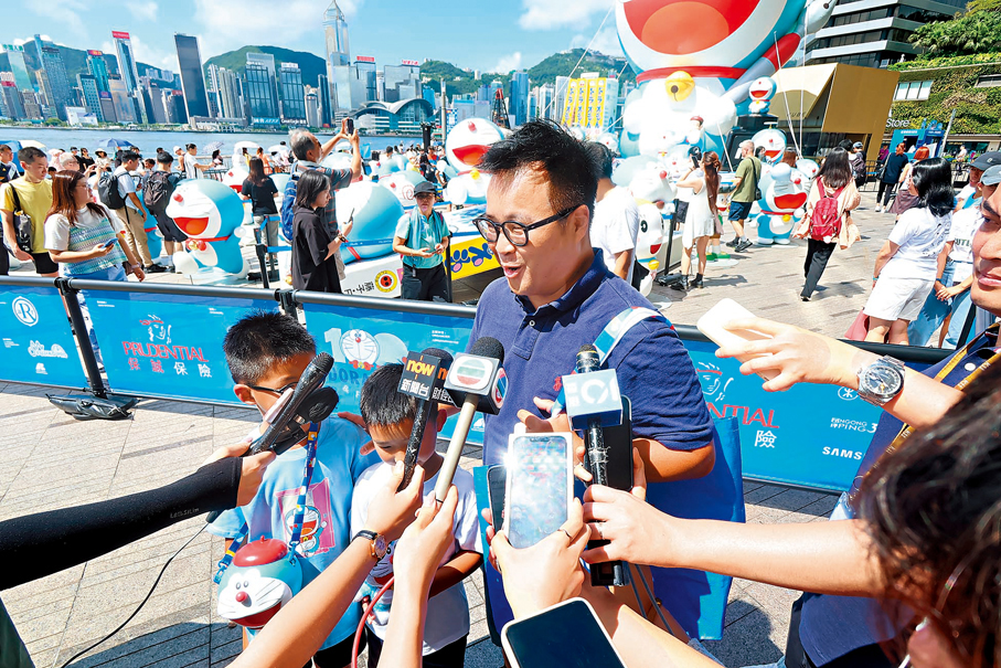 (香港文匯報記者 郭倩 涂穴)踏入七月暑假旅遊黃金檔期,香港盛事接連不斷。為期約一個月的「100%多啦A夢&Friends巡迴特展」昨日上午在尖沙咀星光大道正式開幕。雖然天氣炎熱,但無阻入場人士的熱情,現場人頭湧湧,不少是遠道從世界各地來港觀展的「鐵粉」,有旅居美國的港人特意舉家回港,一家大細參觀展覽,該名父親說:「小朋友第一首接觸的兒歌就是多啦A夢主題曲!」有內地旅客清晨六時出發來港觀看展覽,有專程來港觀展的菲律賓遊客更計劃花1.5萬港元購物。香港旅遊業界人士透露,近日接連收到其他地區旅行社查詢展覽詳情,估計展覽期間全港約有200萬至300萬人次旅客來港,「十居其九都會參觀多啦A夢展覽。」