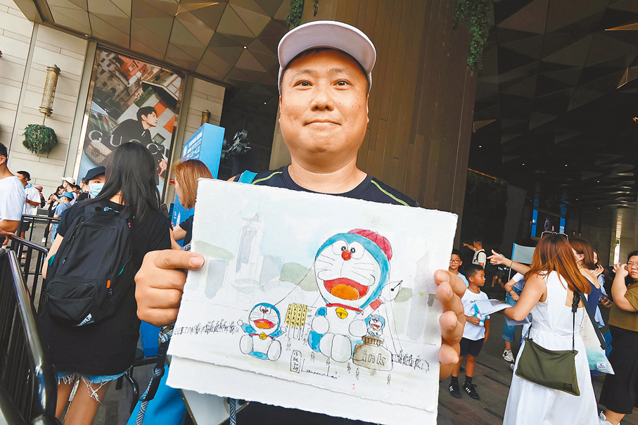 來自深圳的旅客蕭先生為多啦A夢瘋狂,昨日清晨六時多就從家出發來港,「我喜歡多啦A夢已經有二十多年,我最欣賞的就是多啦A夢和大雄的友情,大雄的樂觀精神也一直激勵着我。」他計劃在多啦A夢展覽期間多次來回香港和深圳,並於本月20日再來港欣賞多啦A夢無人機匯演,「觀完展後會在周邊玩一玩,品嘗香港的美食。」