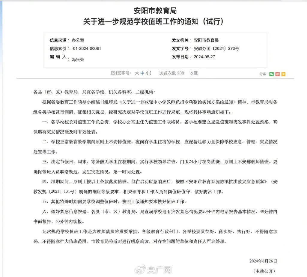 近日,河南省安陽市、南陽市、三門峽市、洛陽市等地的教育主管部門下發通知或開展專項行動,切實減輕中小學教師負擔,原則上不安排一線教師參與假期值班工作。洛陽市實驗初級中學一位負責人向中國之聲介紹,這個暑假的校內值守工作,每天只安排一位行政人員和保安一起應對可能的突發情況。