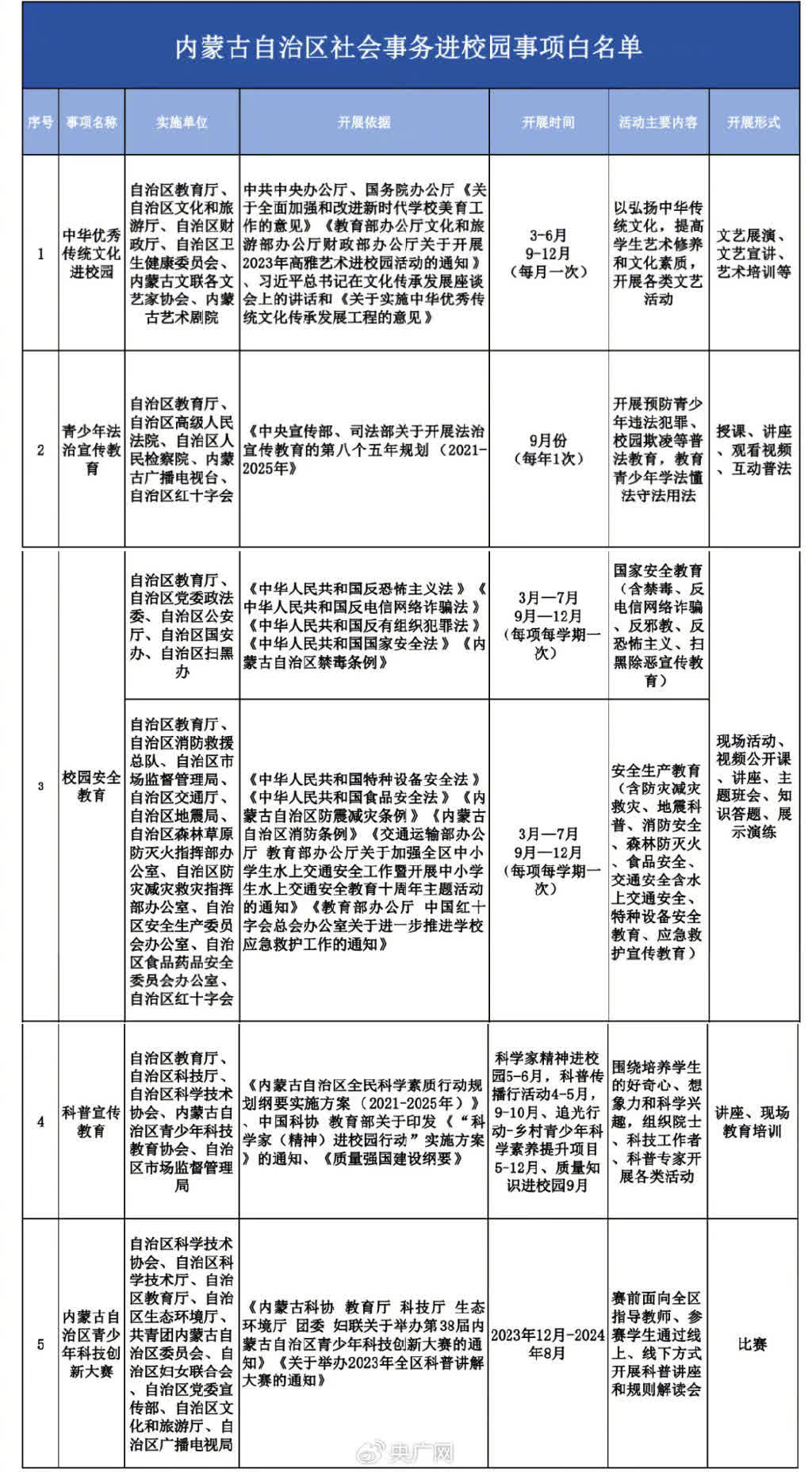 全國範圍內,各地的中小學教師減負工作正在有序推進。上海市、重慶市、江西撫州等多地發布公告,從5月開始,陸續開展規範社會事務進校園為中小學教師減負專項整治工作;《內蒙古自治區社會事務進校園白名單》近日公布,明確了五大類可以進校園的活動及開展形式、開展時間;未列入「白名單」管理的事項,一律不得進入校園;同一進校園事項一年內一所學校只能進一次。