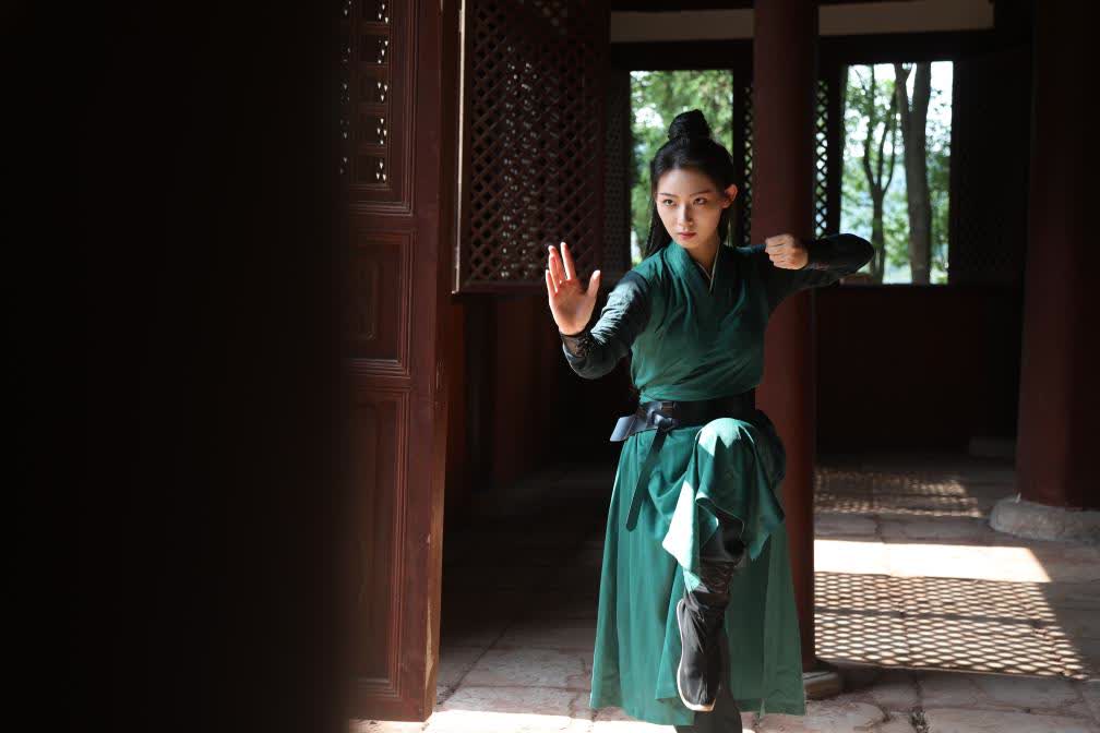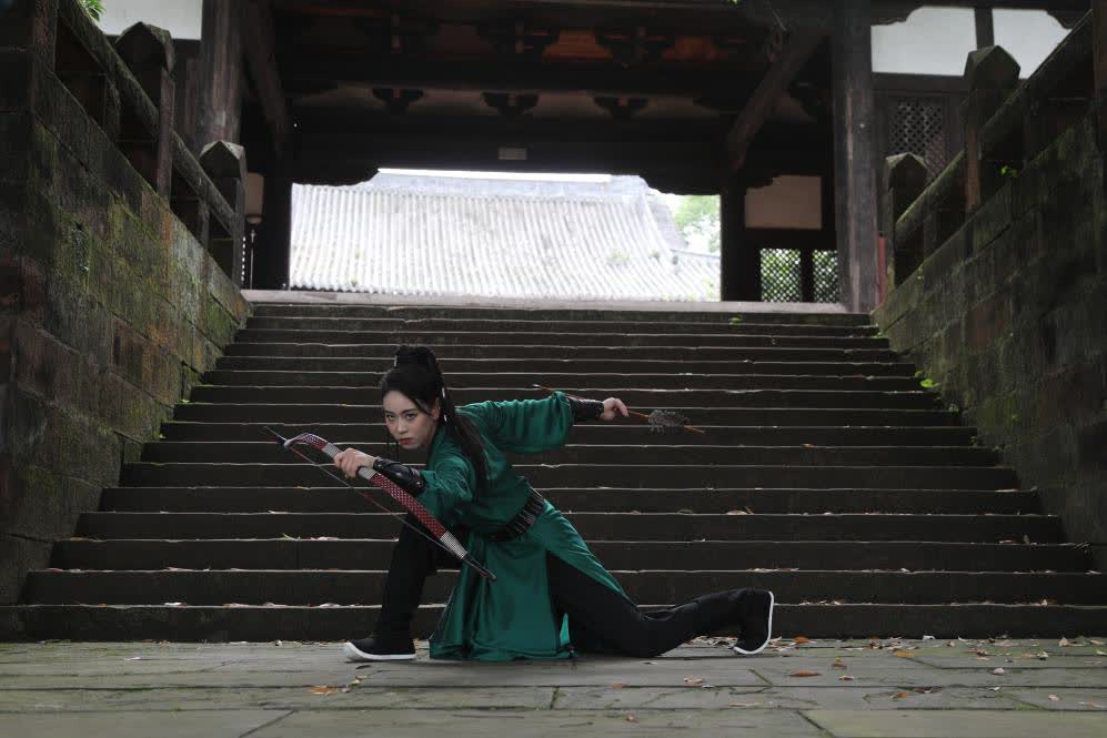 同樣24歲的河南姑娘田超並非武術科班出身,但她的舞蹈專業功底讓動作在鏡頭裏更有美感。為了掌握峨眉武術速度快的精髓,田超日常需要在腿上綁沙袋負重練習,但「看到成片效果這麼美,這麼多人認可我們,覺得很有價值」。