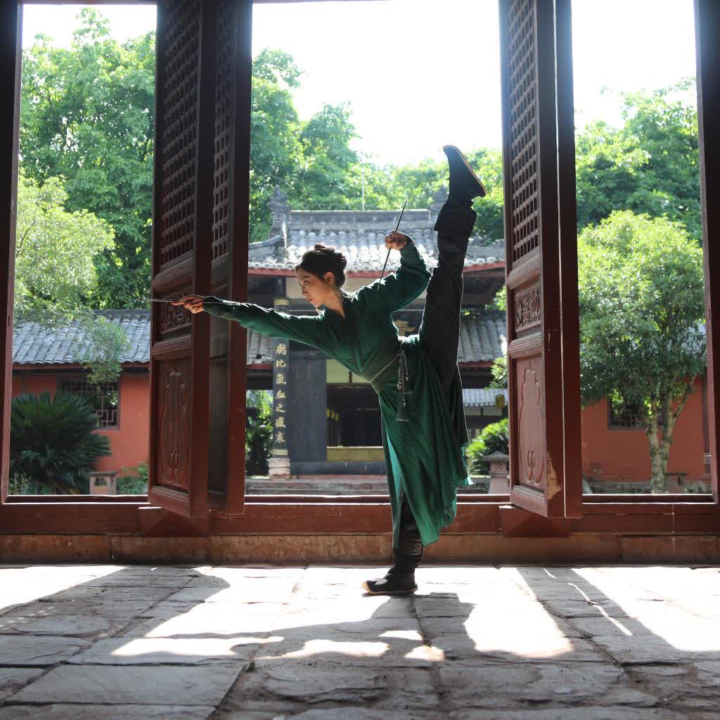 峨眉山市往北約兩公里的飛來崗上,坐落着一座依山而建的大廟飛來殿。十來名身着「峨眉青」勁裝、手持峨眉劍/刺的妙齡女子步履匆匆,徑直推開厚重的朱漆殿門,眼前一殿高過一殿,竟別有洞天。一直抵達最深處的清虛園,這群俠女才散開,各自演練起來,聲聲嬌叱瞬間刺破了青山翠谷、廣宇古剎的幽靜。劍氣縱橫,拳拳生風,一招一式似柔實剛,恍如峨眉派重現江湖,又似一幅鮮活的水墨畫。
