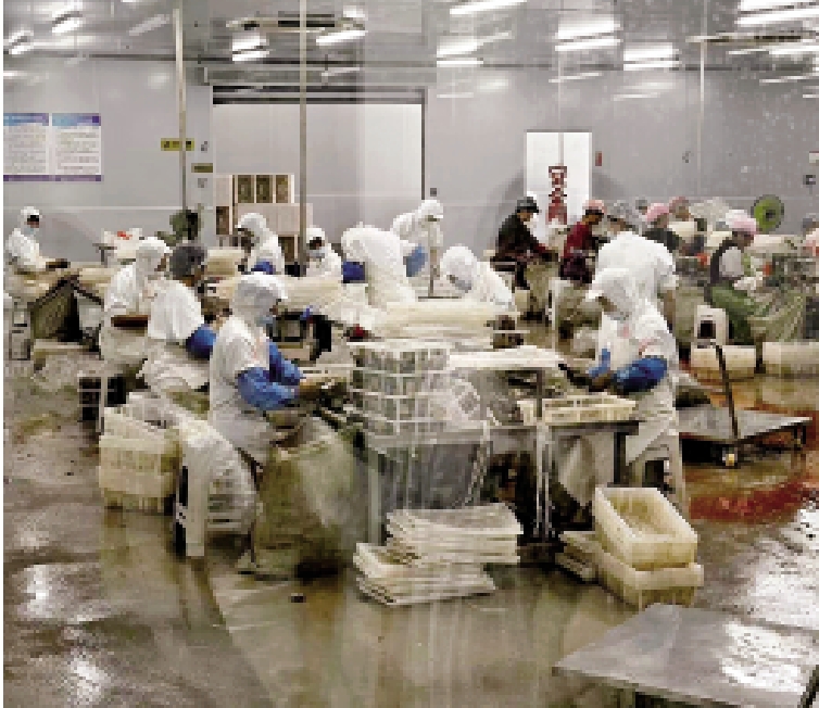 時下正值鮑魚收穫加工旺季,一走進長太生物的生產車間,香港學子們就明顯感覺到一股海腥味撲面而來,現場一片繁忙而有序的景象。大家被眼前分工明細的產業線所吸引:鮑魚的搬運與分離的工序由人力完成,而清洗、分揀、速凍等更為複雜的工序則由智能化生產設備完成。同學們觀察到,工人們把去殼去肚的鮑魚肉倒入克重分級機,一顆顆鮑魚「排排坐」在一個個料盒裏,旋轉的機器快速地將它們按重量分選,倒入不同的箱子裏。據介紹,短短5分鐘內,就可以完成8公斤的鮑魚分選。