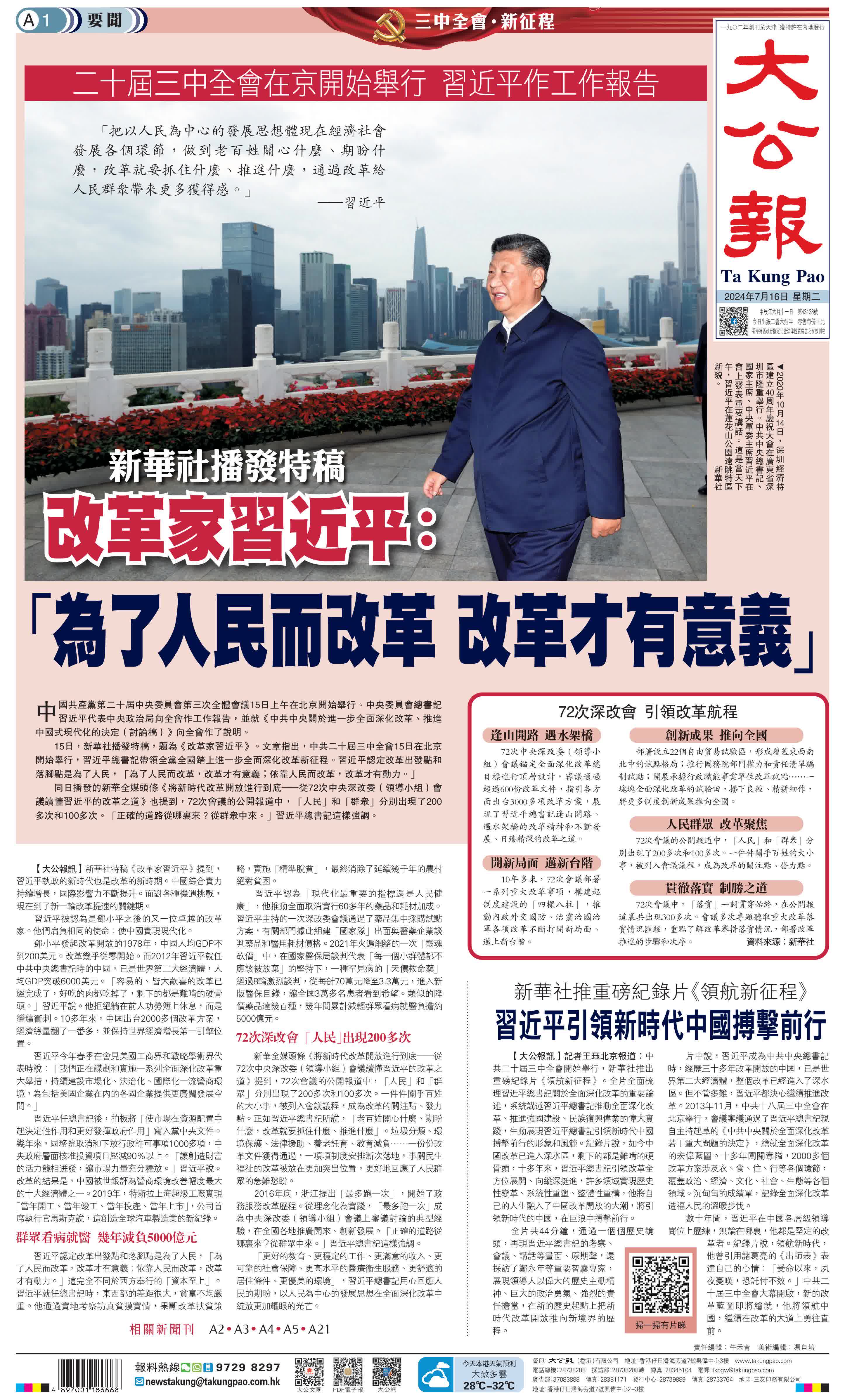 15日,新華社播發特稿,題為《改革家習近平》。文章指出,中共二十屆三中全會15日在北京開始舉行,習近平總書記帶領全黨全國踏上進一步全面深化改革新征程。習近平認定改革出發點和落腳點是為了人民,「為了人民而改革,改革才有意義;依靠人民而改革,改革才有動力。」