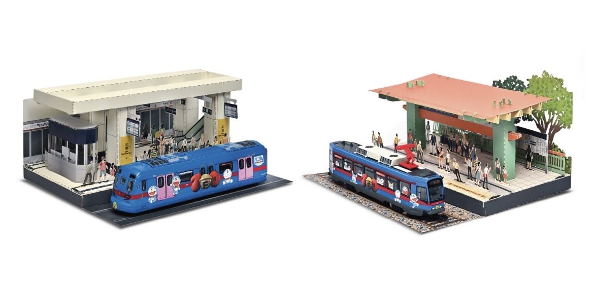 每款「100%多啦A夢 & FRIENDS」車票套裝包括1張車票、一個迷你合金列車模型及一個月台紙藝模型。