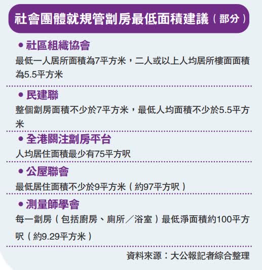 (大公報 記者 王亞毛)政府的「解決劏房問題」工作組將於下月向行政長官提交報告,就設定劏房居住環境最低標準提出建議。多個團體近日紛紛提出建議,公屋聯會昨日表示,劏房的「起始租金」問題可適時再研究,避免令劏房市場供應緊張。就劏房最低面積,該會建議不少於9平方米,避免太多不合規的劏房被淘汰。該會並建議政府利用過渡性房屋、簡約公屋及部分閒置隔離設施,安置受規管執法影響的劏房戶,避免基層居民流離失所。