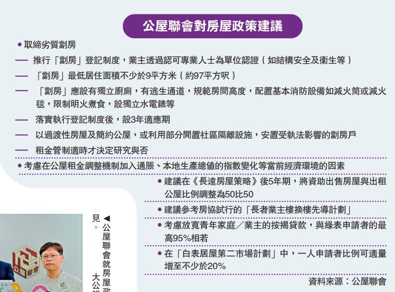 公屋聯會並建議優先解決劣質劏房,有關「起始租金」問題,可適時才決定研究與否。梁文廣說,管制劣質劏房會直接影響劏房供應,若一併進行租金管制,短時間內給業主太多限制,可能令業主放棄經營劏房,導致供應更緊張,「我們希望一步步來,等劏房市場從租賃程序、權責,到其設施、安全、管理都合適,再讓租金靠供求做好調節。」