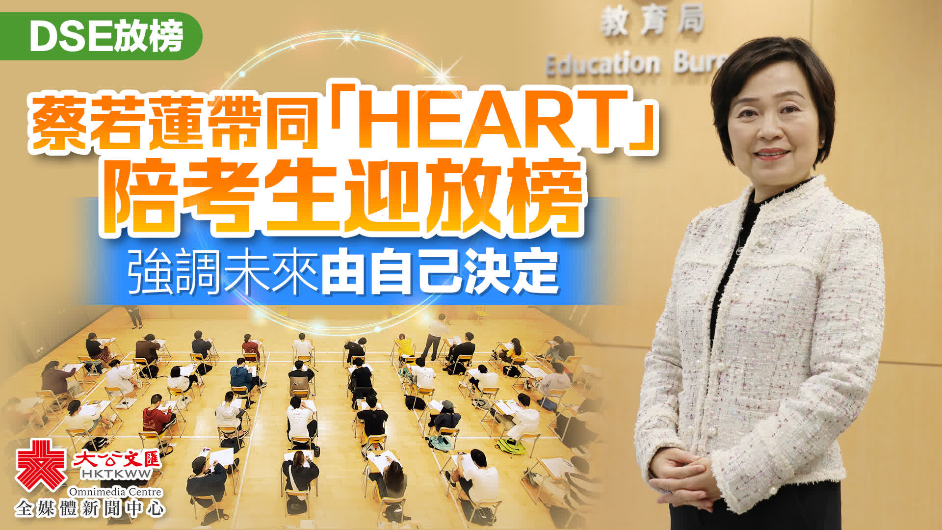 蔡若蓮指,自己帶同一個「心(HEART)」來陪同學們一齊迎接放榜。她指,H代表Health,希望同學都有健康的體魄。E則是Emotional well-being,面對挑戰正向情緒很重要。她呼籲同學們無論結果是怎樣,不要忘記自己的夢想,自己未來是怎樣,由自己決定,不是由成績單決定。