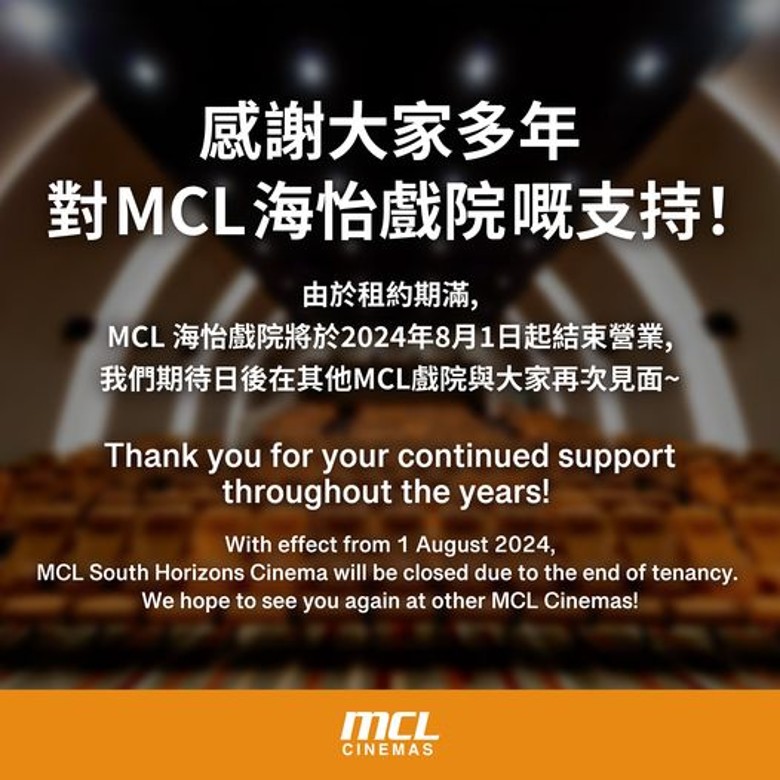 MCL Cinema發文表示,由於租約期滿,位於南區鴨脷洲海怡半島的MCL海怡戲院將於2024年8月1日起結束營業,感謝大家多年來對MCL海怡戲院的支持。