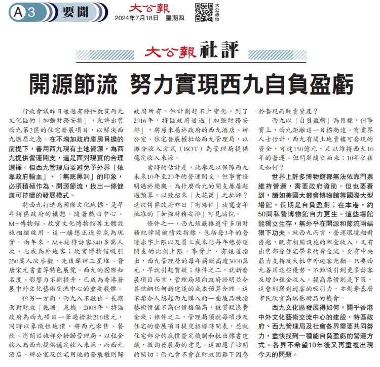 行政會議昨日通過有條件放寬西九文化區的「加強財務安排」,允許出售西九第2區的住宅發展項目,以解決西九燃眉之急。在不增加政府庫房負擔的前提下,善用西九現有土地資源,為西九提供營運開支,這是面對現實的合理選擇。但西九管理局要避免予外界「依靠政府輸血」、「無底黑洞」的印象,必須積極作為、開源節流,找出一條健康可持續的發展模式。