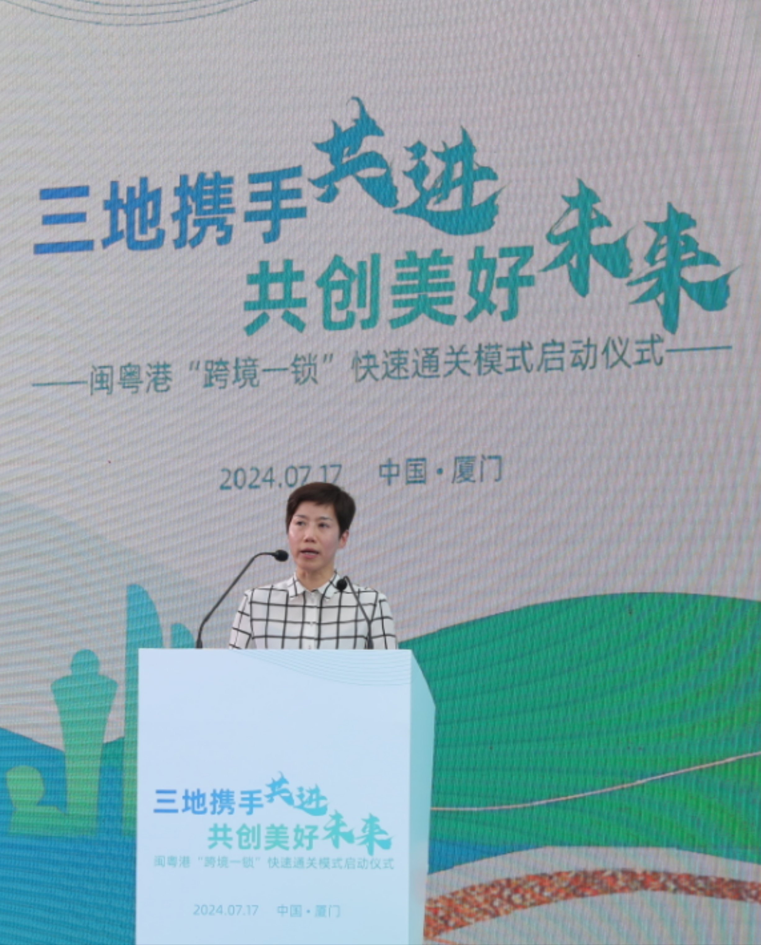 何珮珊昨日下午出席閩粵港「跨境一鎖」快速通關模式啟動儀式,並於致辭中提到,福建正式開通的三個「跨境一鎖」清關點,有助進一步推動「閩粵港」互聯互通和貨物便捷流動,也標誌着內地與香港海關在通關便利合作上取得了新突破。