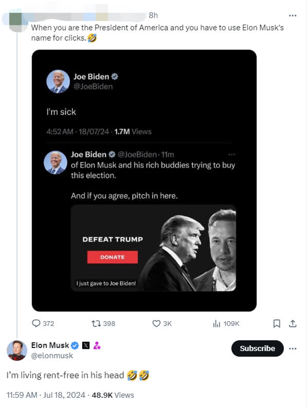 據俄新社報道,一名網友17日晚些時候在X上轉發了拜登帖子的截圖並在配文中稱,「當你是美國總統時,你不得不用埃隆·馬斯克的名字來博取流量」。對此,馬斯克在評論區稱,「我免費住在他的腦海里」。馬斯克還在這句話最後配了兩個「笑哭」的表情包。