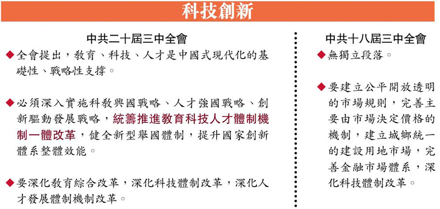 因應紛繁複雜的國際國內形勢,面對新一輪科技革命和產業變革,「科技創新」在公報中也處於靠前段落。全會強調,必須深入實施科教興國戰略、人才強國戰略、創新驅動發展戰略,統籌推進教育科技人才體制機制一體改革,健全新型舉國體制,提升國家創新體系整體效能。