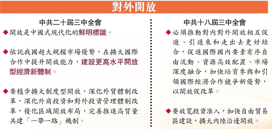 引人關注的是,對於「高水平社會主義市場經濟體制」中市場與政府的關係,從中共二十大報告的「充分發揮市場在資源配置中的決定性作用,更好發揮政府作用」,到中共二十屆三中全會的「必須更好發揮市場機制作用」,既「放得活」又「管得住」,「更好維護市場秩序、彌補市場失靈」等,這些表述再為市場主體派定心丸,保證所有市場主體公平競爭、平等保護,並為突破現有體制機制藩籬做出具體部署。