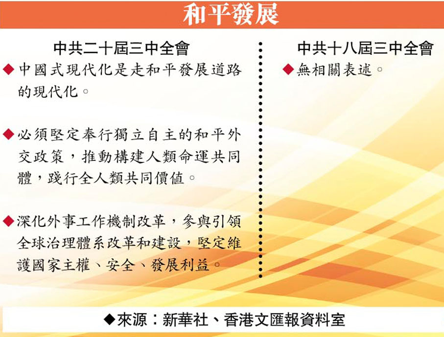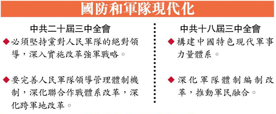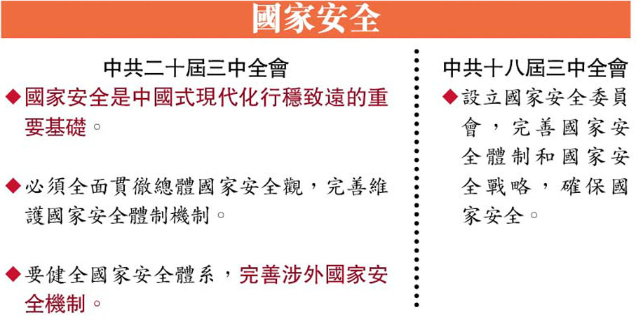 值得注意的是,公報在闡述進一步全面深化改革總目標的段落中,將「建設更高水平平安中國」列為七大「聚焦」任務之一,這亦是與十八屆三中全會公報表述顯著不同之處。