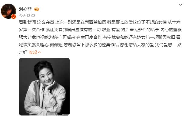 演員劉亦菲發文悼念:「感謝您留下那麼多的經典作品,感謝您給大家的愛,我們愛您,一路走好。」