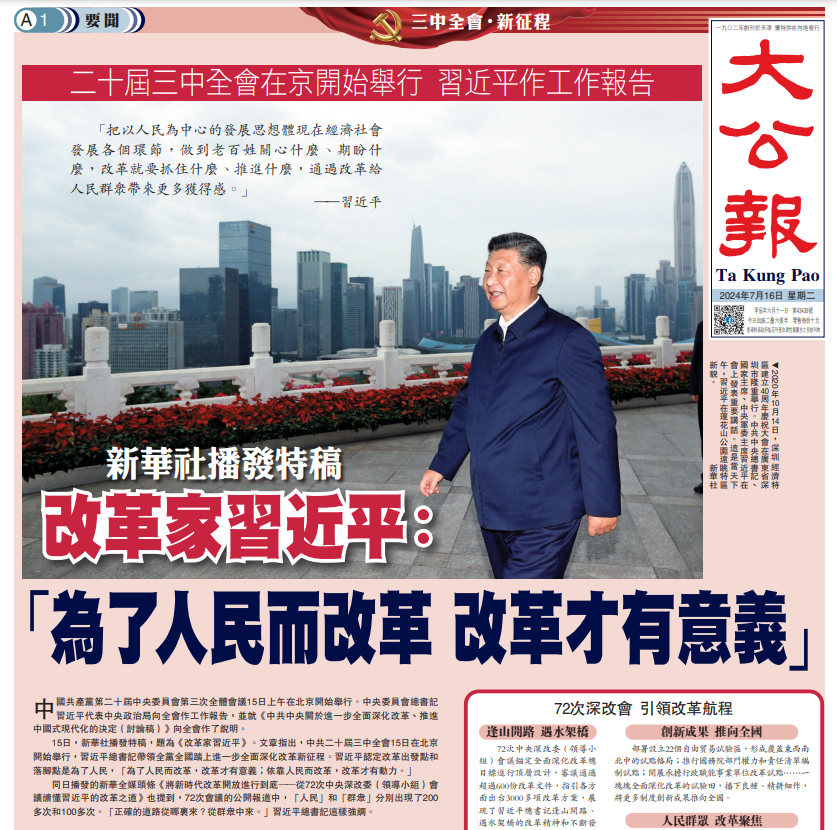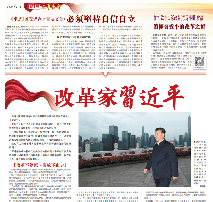 大公文匯全媒體報道,中共二十屆三中全會7月15日舉行當天,新華社對外播發人物特稿《改革家習近平》,《大公報》、香港《文匯報》都予以轉載,在港澳地區讀者中引起強烈反響。