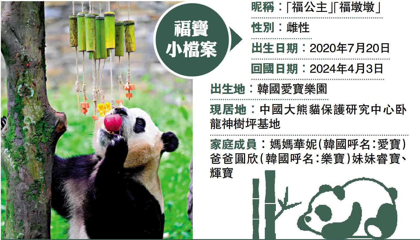 最近,徐翔對「福寶」的性格特徵有了一個新的概括─「搗蛋小淑女」。在他看來,「福寶」性格比較溫順、比較乖,不怎麼亂拖東西,吃飯時挺愛乾淨,所以是「淑女」;但出去玩的時候也很活潑調皮,喜歡蹦蹦跳跳、爬上爬下、鑽洞,還是有一點「搗蛋」。徐翔笑言,「福寶」很注意對自己的身材管理,回來快3個月,體重基本就是103公斤上下,雖然坐着的時候看起來變圓了一些,但站着或走起來還是挺修長的,「算是身材保持得比較勻稱的一隻熊貓」。