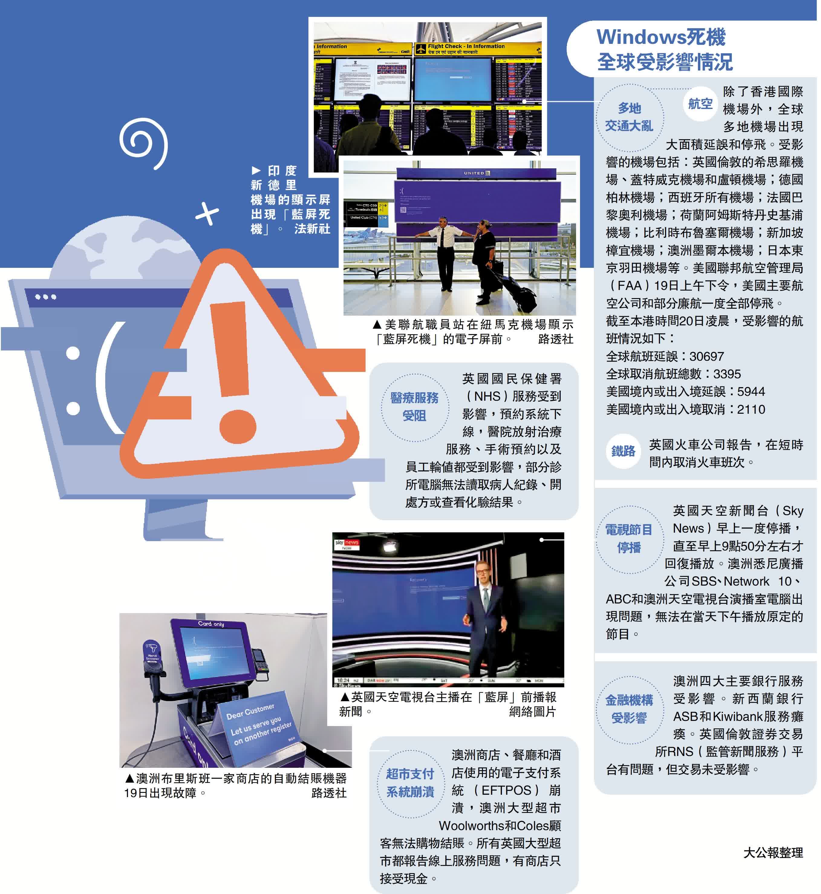大公報綜合報道,受網絡安全公司CrowdStrike更新影響,美國微軟的Windows操作系統19日出現大規模死機,全球各地的電腦出現「藍屏死機」,辦公程序Microsoft 365(Office 程序)和Azure的雲端服務都無法使用。本次電腦系統故障影響廣泛,除了造成航空與鐵路運輸停擺、銀行業癱瘓、媒體停播,企業和用戶叫苦不迭。有媒體形容,這可能是「史上最大規模電腦死機」,在全球釀成「數字災難」。