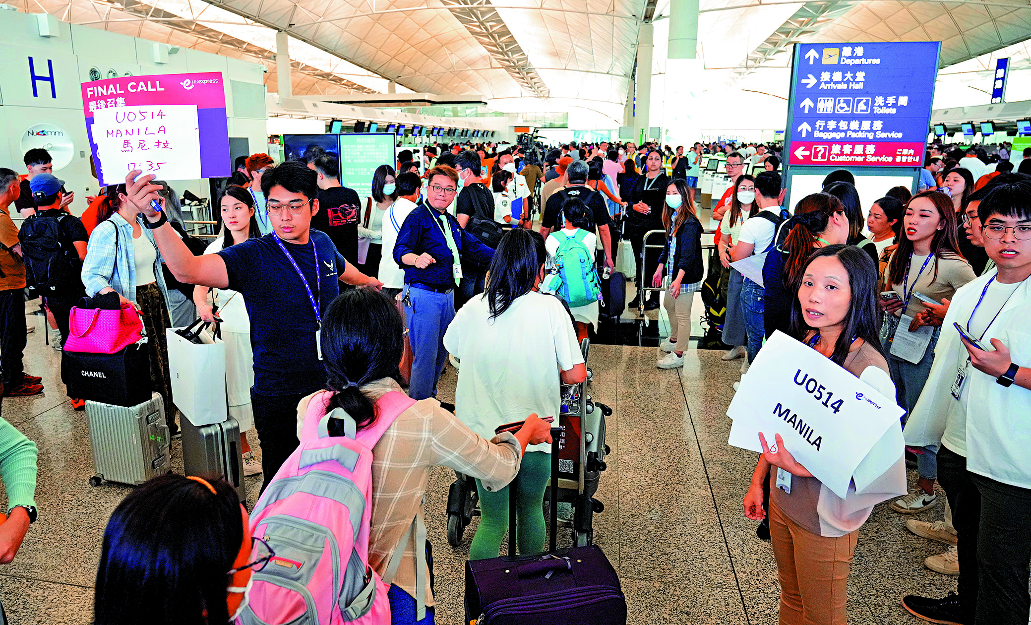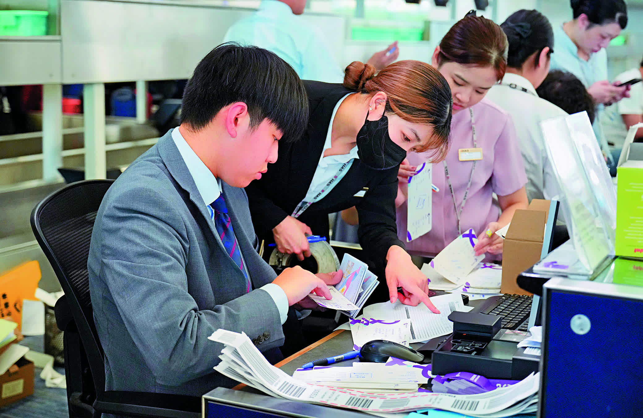 大公報記者現場所見,機場大堂有大批旅客排隊等候辦理登機,有部分航班因延誤或取消,令到有旅客原定當日離港的航班被改至翌日起飛,被迫滯留機場。有旅客不滿航空公司沒有為受影響旅客安排住宿而與機場職員理論。至晚上6時許,原本「打蛇餅」的人龍才開始消散。
