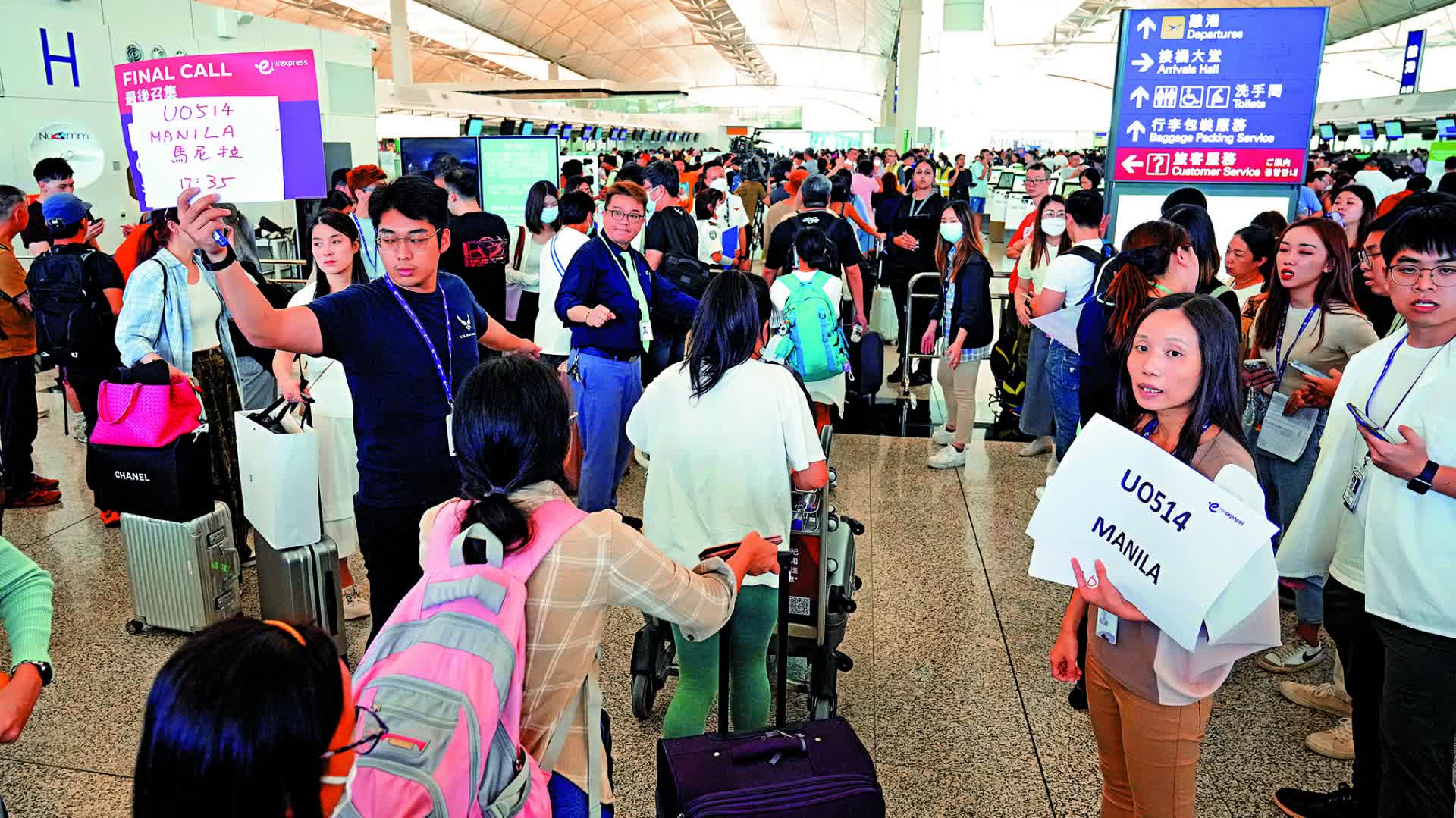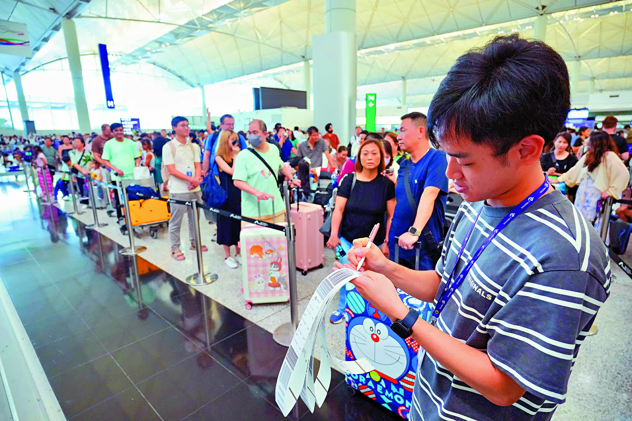香港國際機場大堂昨日因「死機」事故,導致大批旅客排隊等候辦理登機。有旅客航班延誤數小時、也有的被迫改到次日飛,有旅客邊排隊邊進食,有帶着小朋友的旅客讓子女直接睡在行李箱上苦等,更有旅客不滿鼓譟;有航空公司因沒有採用微軟系統而不受事件影響。