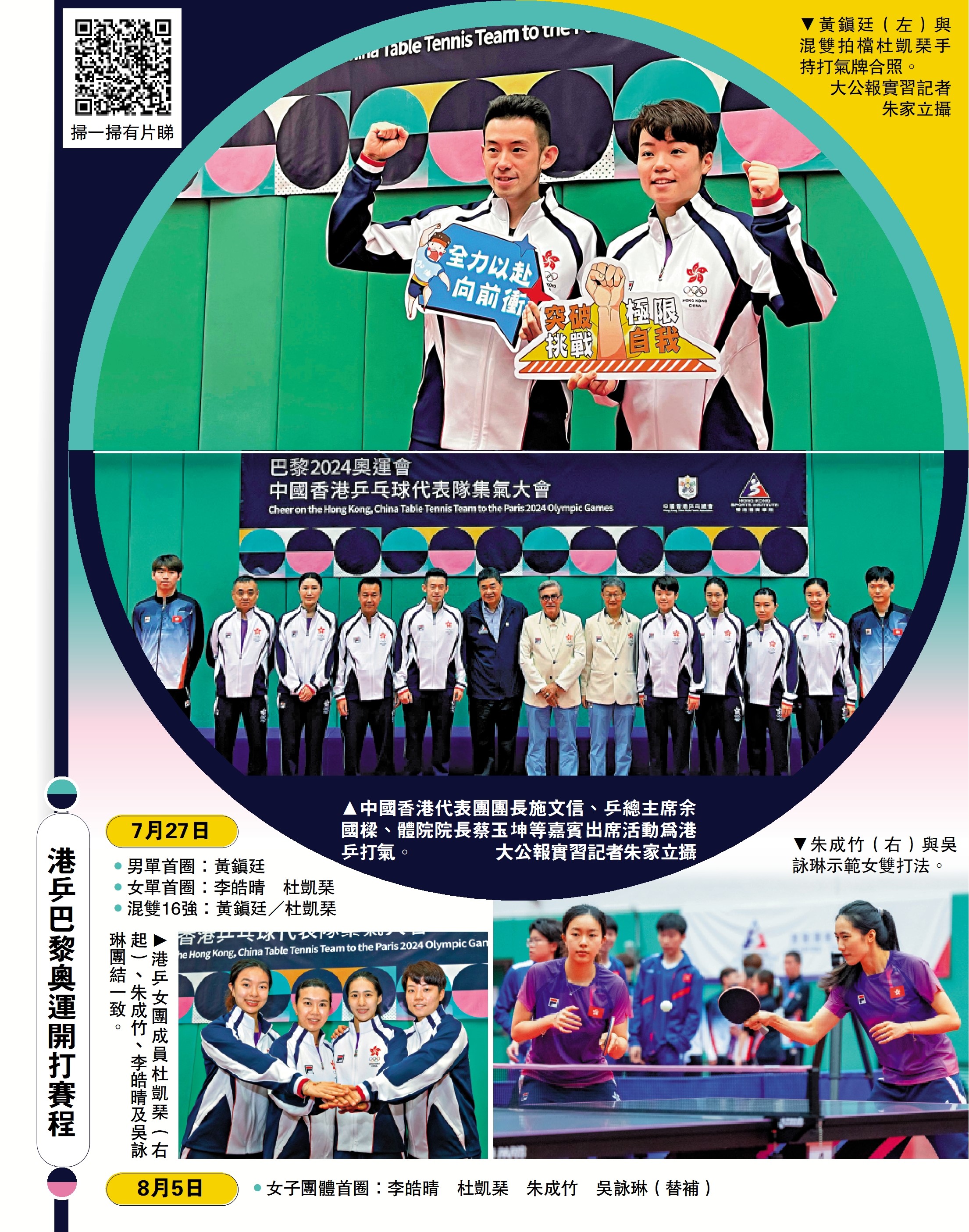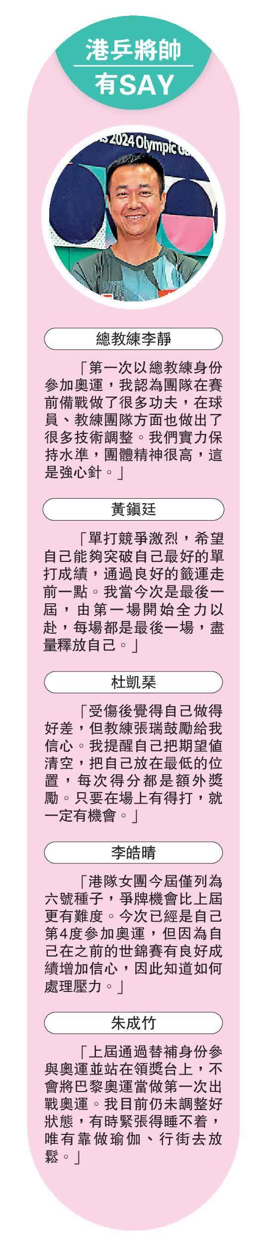 今屆奧運港乒隊共獲5張入場券,包括男單、女單、女團以及混雙等4個項目,黃鎮廷、杜凱琹、朱成竹、李皓晴及吳詠琳(替補)出征奧運。